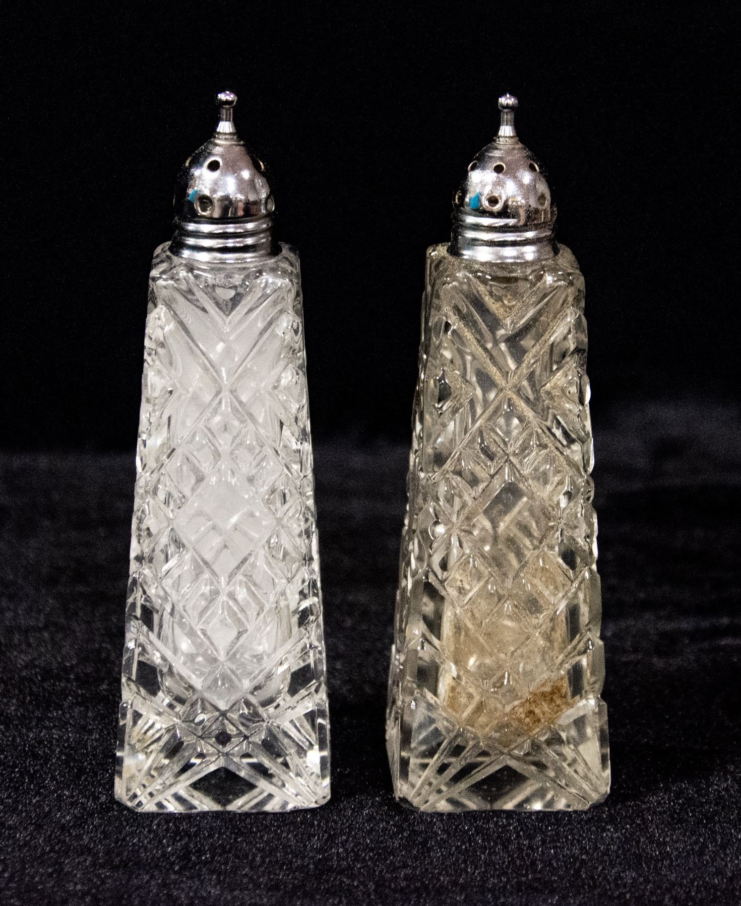 CUT GLASS SALT + PEPPER SHAKERS 5" TALL