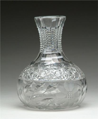 CUT GLASS WATER CARAFE. Carafe with a floral and hobstar cutting and a cut prism neck. SIZE: 8 in. t. CONDITION: Very good to excellent. Estate of Edwin Schiebel Sr. 5-60195