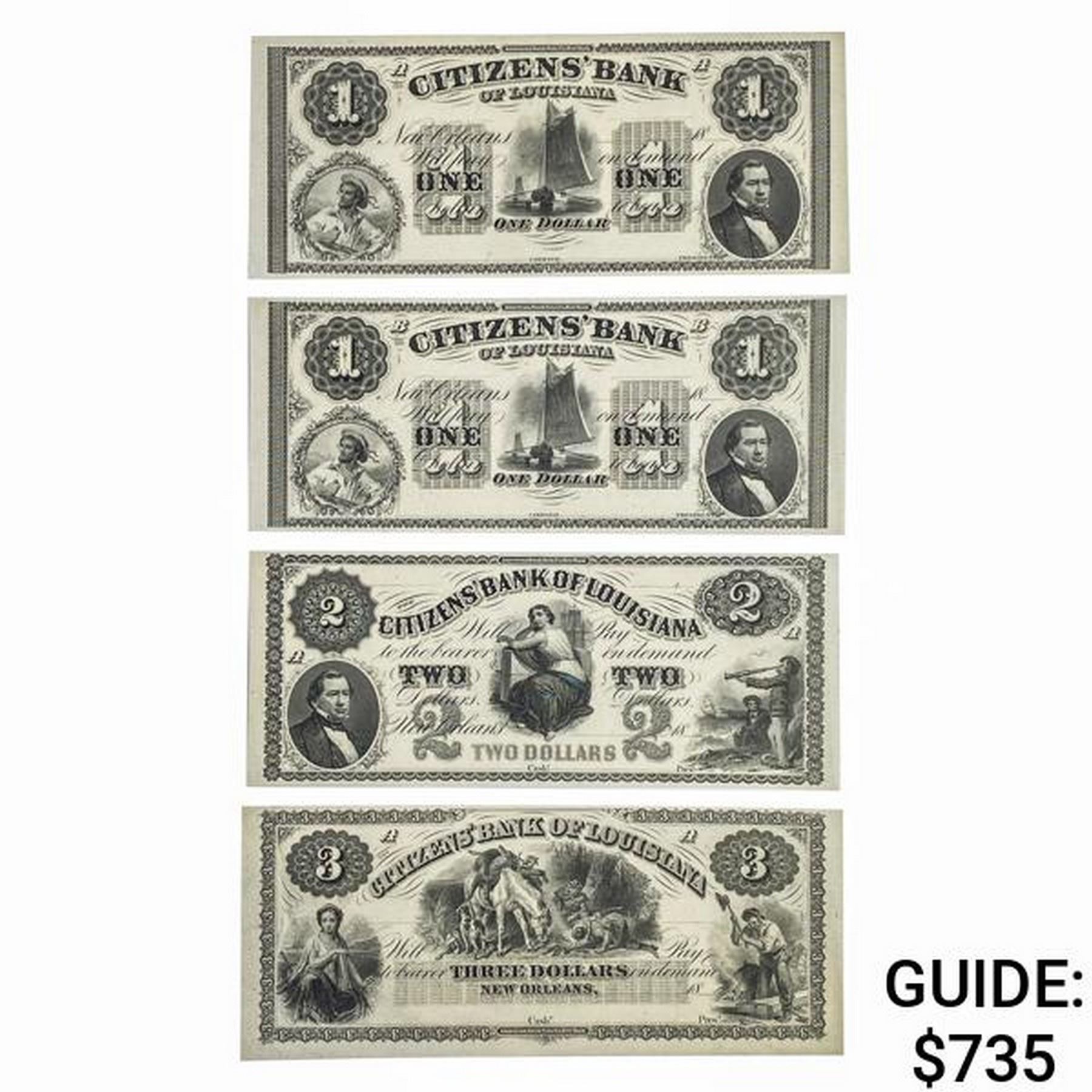 CUT SHEET OF 1800's $1, $1, $2, $3 CITIZENS BANK OF LOUISIANA NEW ORLEANS, LA OBSOLETE NOTES GEM UNCIRCULATED