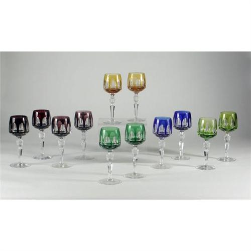 CRYSTAL: Twelve cut-to-clear crystal stemware goblets to include two each ruby, amethyst, cobalt, green, apricot, and limegreen, unattributed, 8'' x 2.75'', factory flaw noted to one ruby glass (open bubble on underside).
