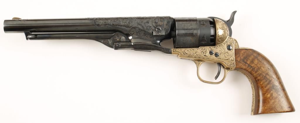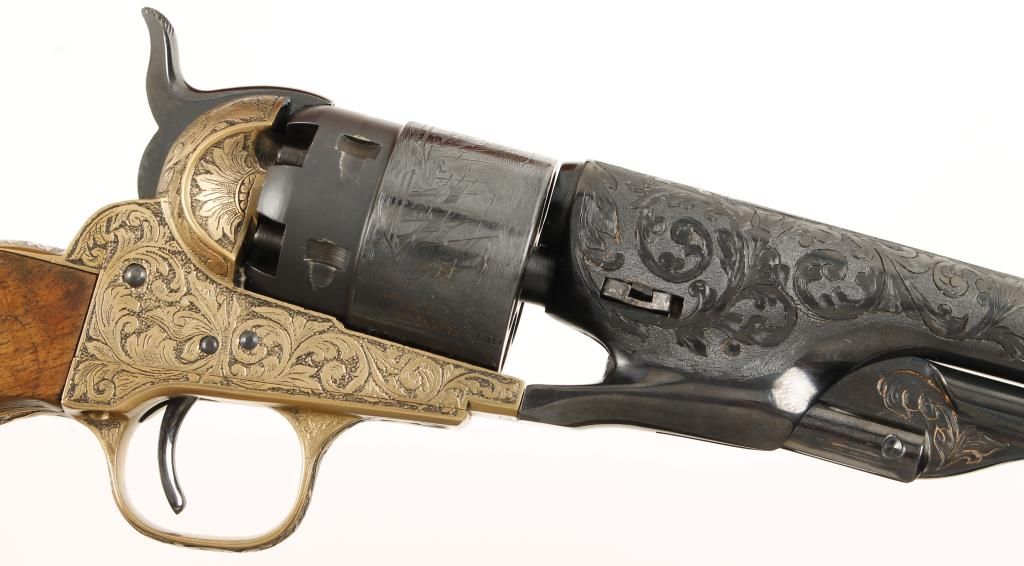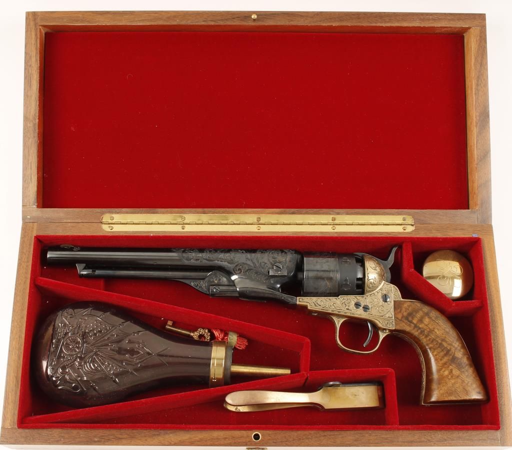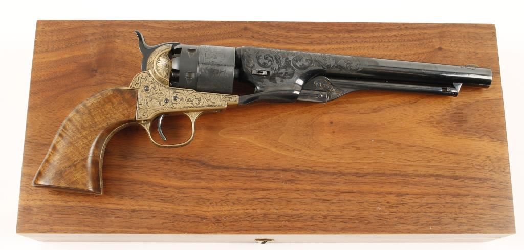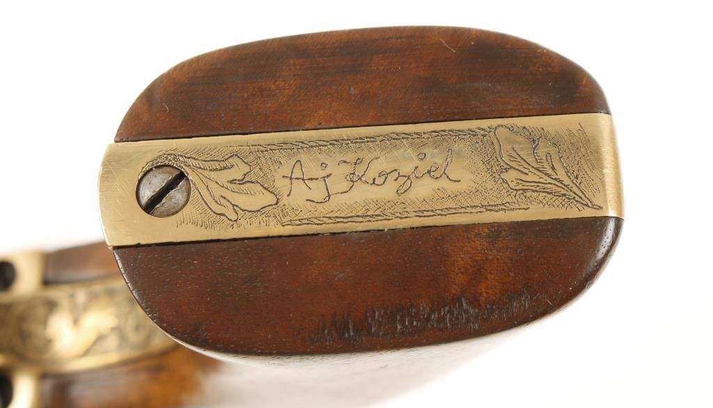 Cased and engraved replica black powder single action 6-shot percussion pistol. Blued 8" barrel. Blued loading lever, cylinder, hammer and trigger. Brass frame, trigger guard and backstrap. Butt is signed "A. J. Koziel" (engraver?) Not cut for a shoulder stock. Lined hardwood case with loading tools and a key. Condition is very good. *Antique Firearm*