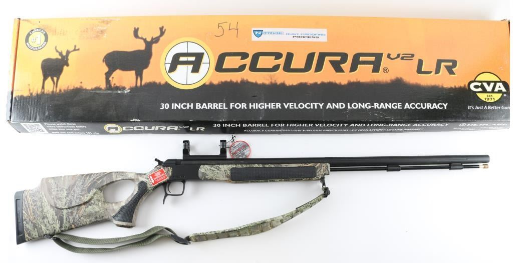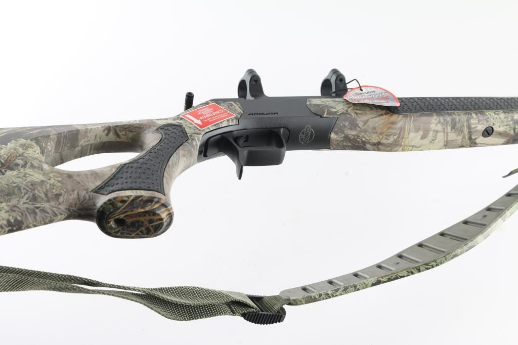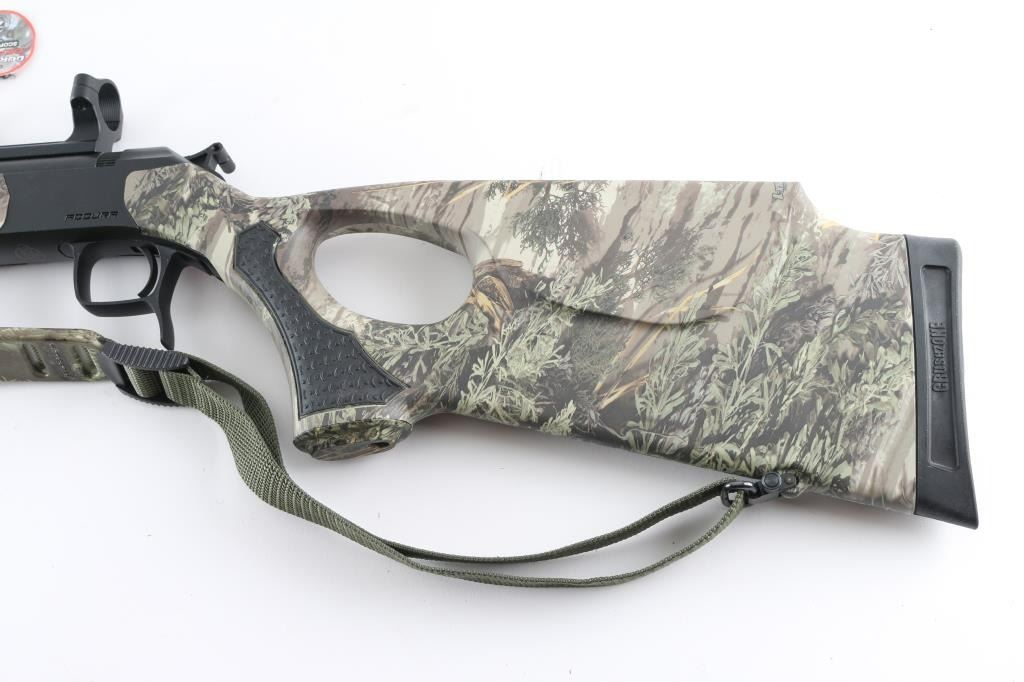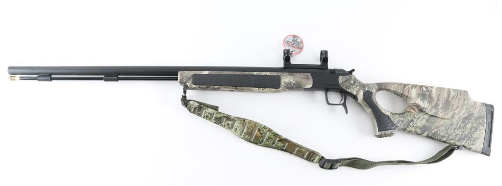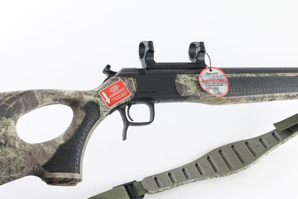 Break-top single- shot rifle. Blued steel, with camo thumb hole synthetic stock, and forearm. 25" grooved, heavy barrel. Quick release breech plug. Textured black rubber panels on the wrist, and forearm. Rubber recoil pad. Durasight scope rail attached to top of the 30' fluted Bergara barrel. Bore appears excellent/bright. Action is tight, barrel locks up tight. , and camo sling. You tip the triggerguard to break the barrel. Thumb extension on hammer. Rifle is in new condition, with store tags still attached. Comes in the original factory box. NRA Condition-As New. Antique Firearm.