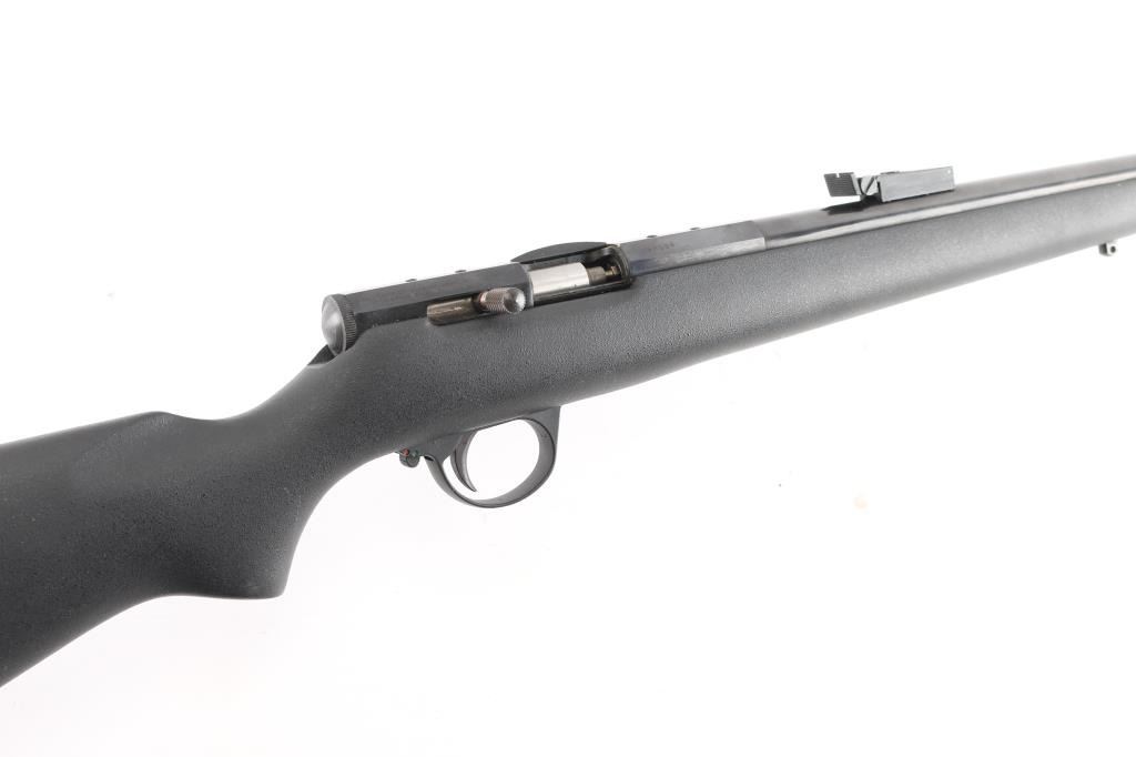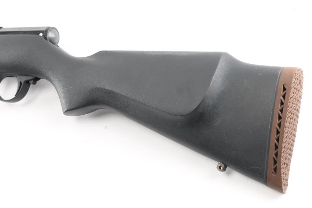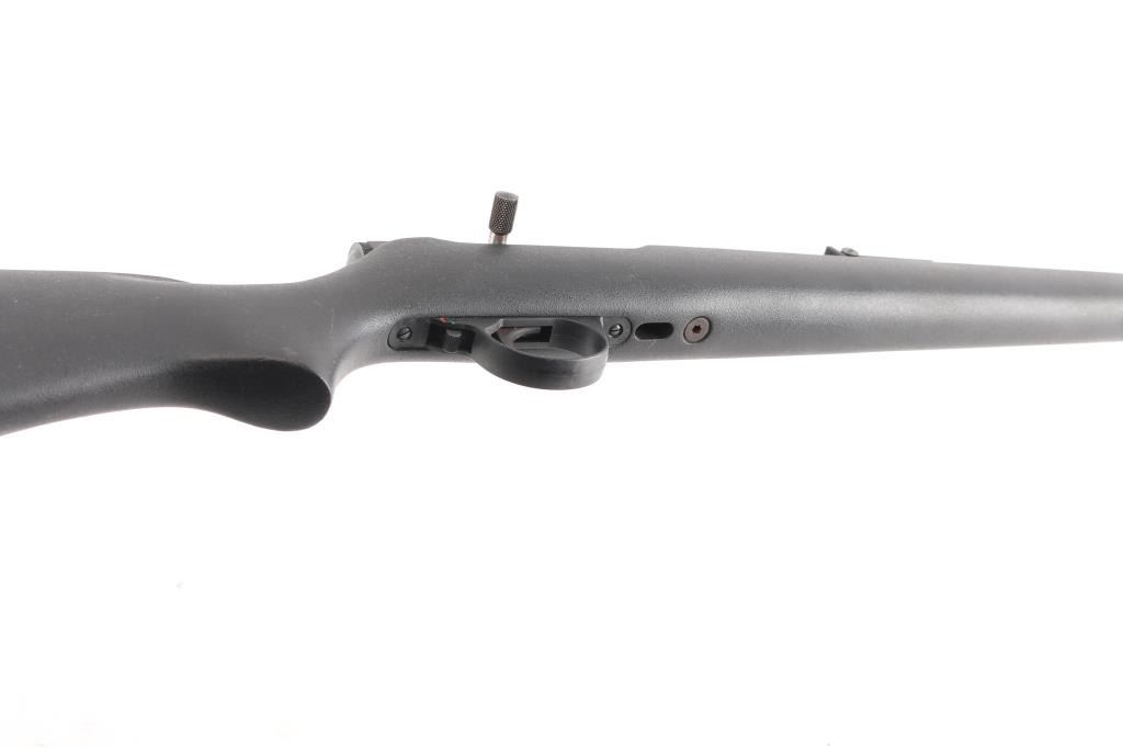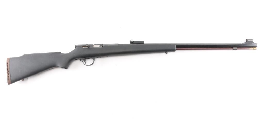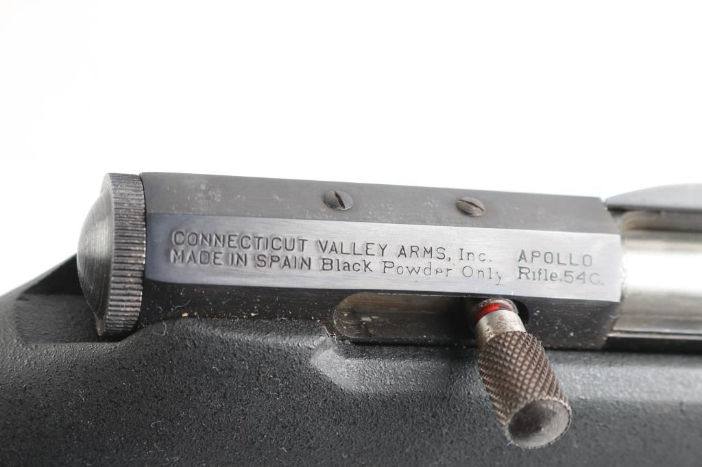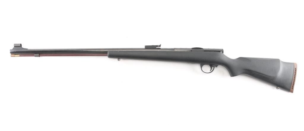 In-line muzzle loading black powder rifle. Blued finish, with one piece black synthetic stock. 21" barrel, with fiber-optic sights. Top of receiver is tapped and drilled for scope rail. Bore appears very good, but is dirty. Action is tight. There is a little loss on the brass-coated tip of the ramrod, otherwise a nice conditioned rifle.
