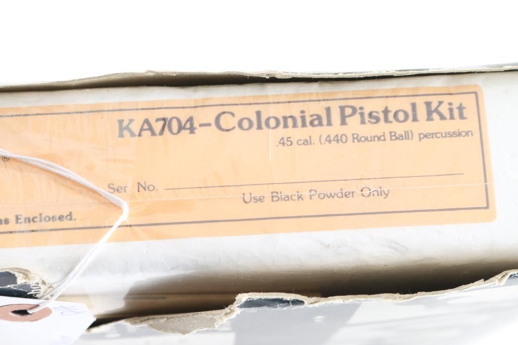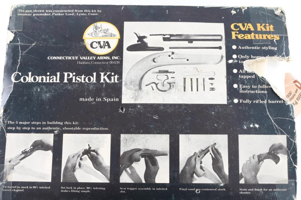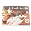 in original box, opened but never assembled. Appears complete. Needs assembly and finishing to complete a side lock percussion pistol for black powder only.