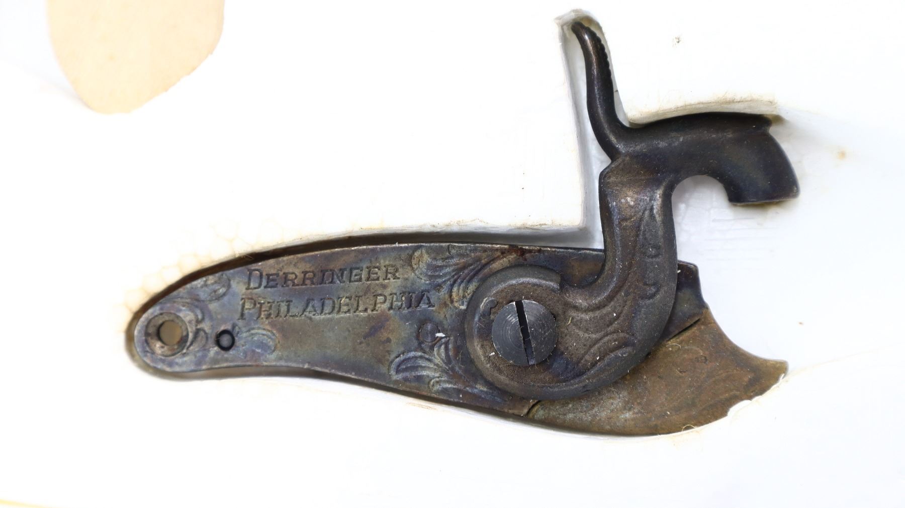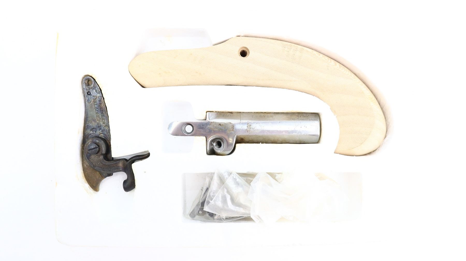 7/10, CVA, MODEL: PHILADELPHIA DERRINGER KIT, CALIBER: 45 CAL PERCUSSION, COMES WITH BOX, MANUAL, BORE IS VERY GOOD, SHINY. UNFINISHED KIT REQUIRES ASSEMBLY AND FINAL FINISHING. NO SIGHTS, OCTAGON BARREL, ENGRAVED COLOUR CASE HARDENED LOCK AND HAMMER. ONE PIECE SMOOTH WOOD GRIP, BRASS TRIGGER GUARD. METAL FINISH SHOWS SOME LIGHT RUST SPECKLES, SCRATCHES AND HANDLING MARKS. GRIP SHOW SOME SLIGHT MARKS., ACTION: PERCUSSION PISTOL, BARREL LENGTH: 70MM, CONDITION: 7/10, SERIAL # 094993, CLASS: CANADIAN PROHIBITED 12-6