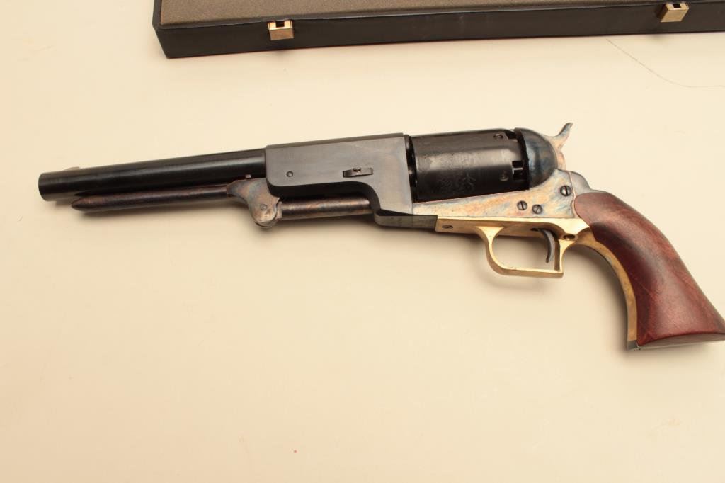 caliber, 9” barrel, blued and case hardened finish, wood grips, S/N A79700, in like new condition showing little handling; accompanied by a modern CVA-marked casing with brass powder flask. (Percussion). Est.: $300-$600.