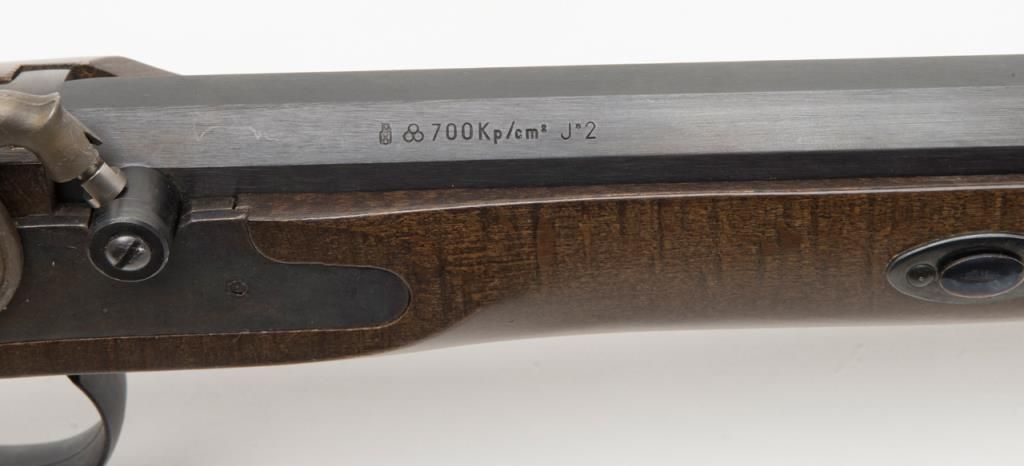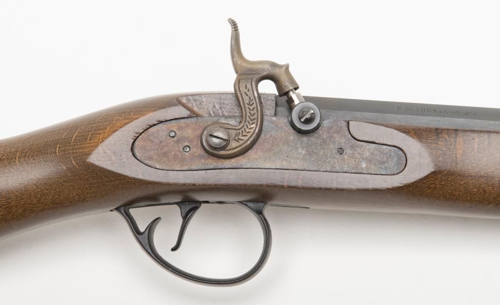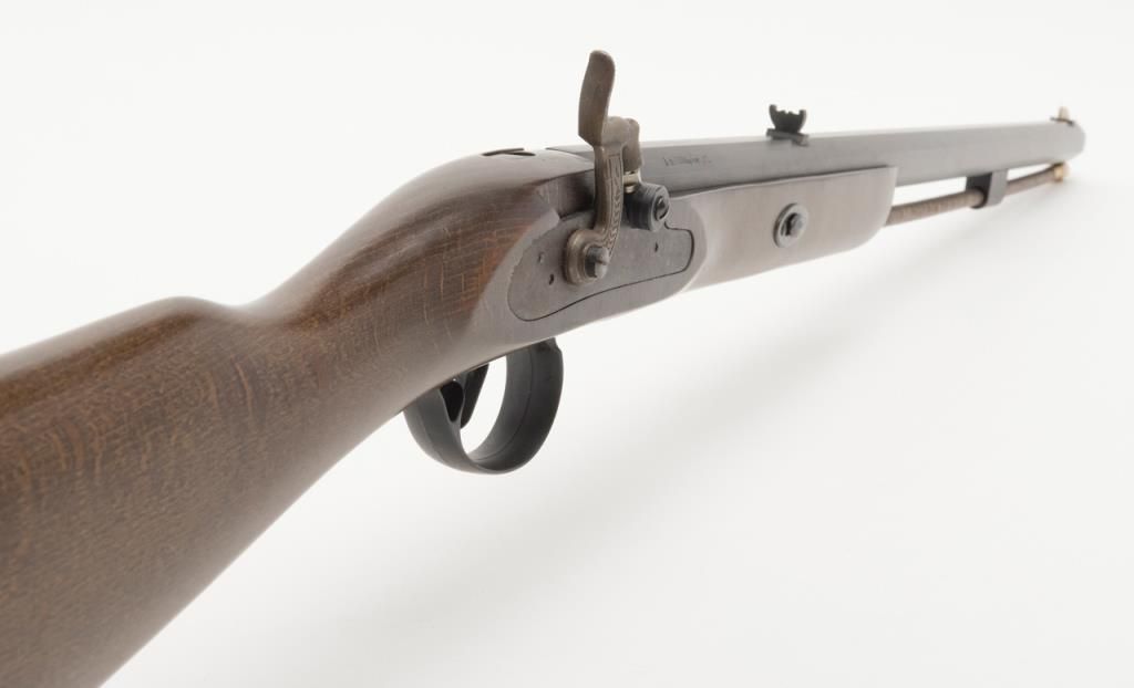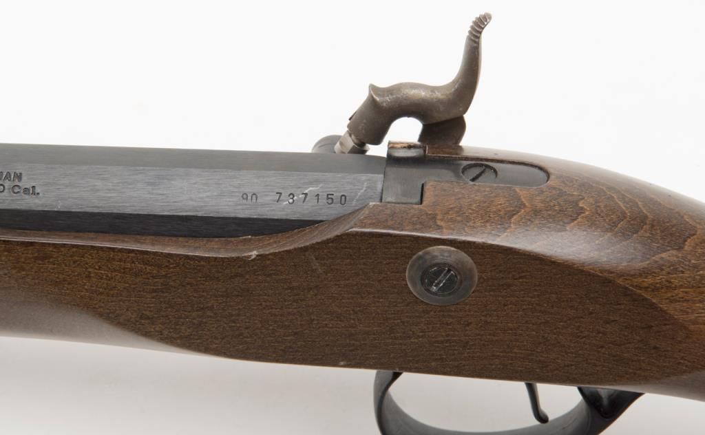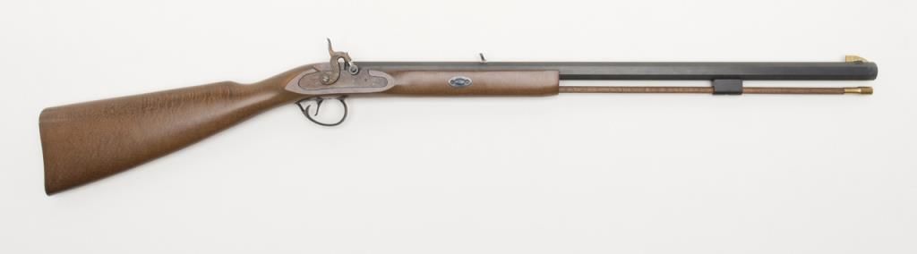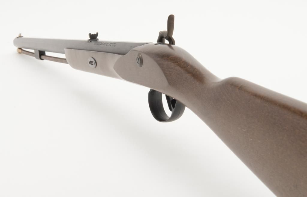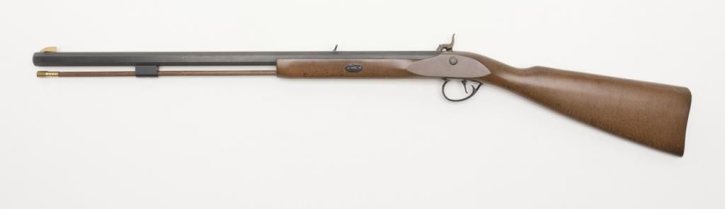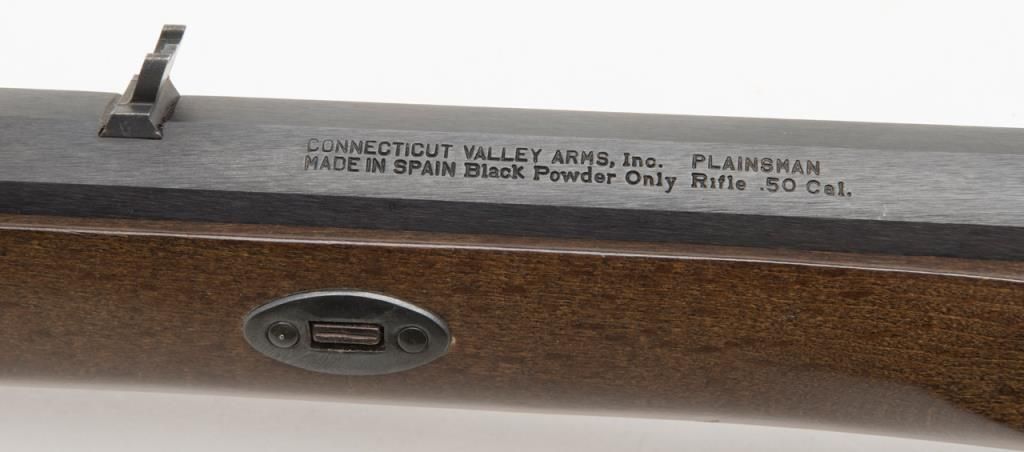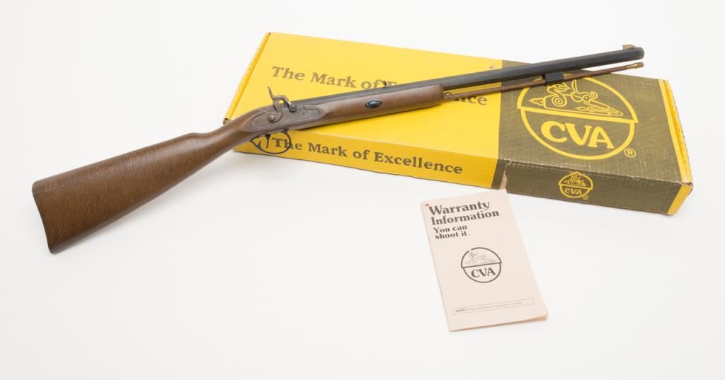 CVA modern percussion half stock plains type blackpowder rifle, .50 cal., 26” octagon barrel, black finish, wood stock, #737150 in like new condition in factory cardboard box. Est.: $100-$200.