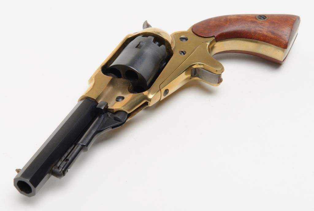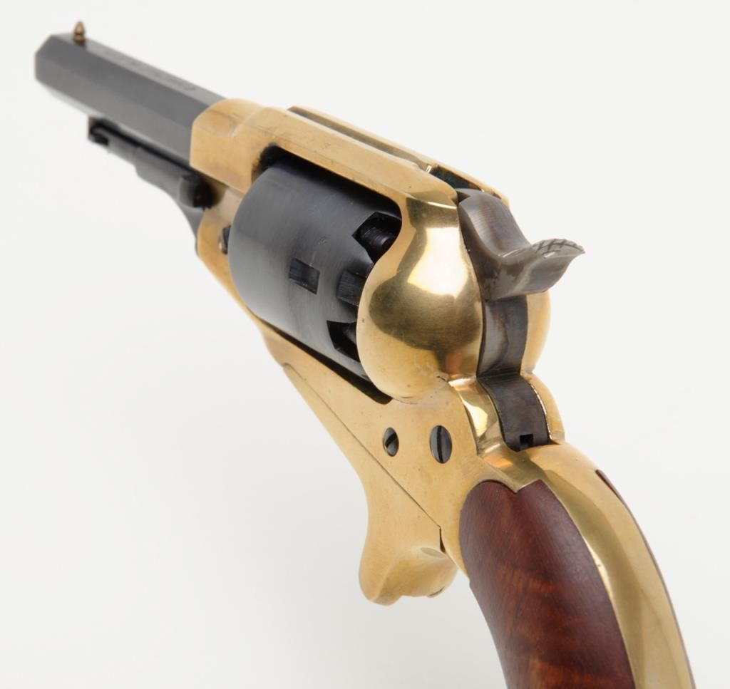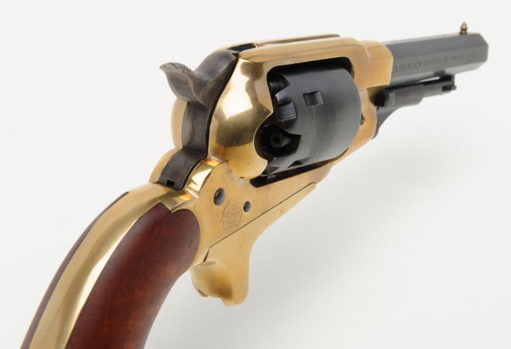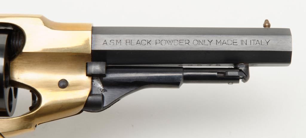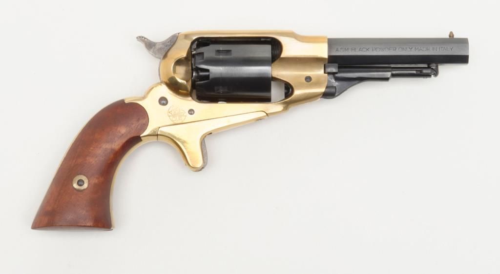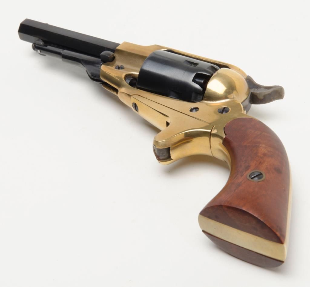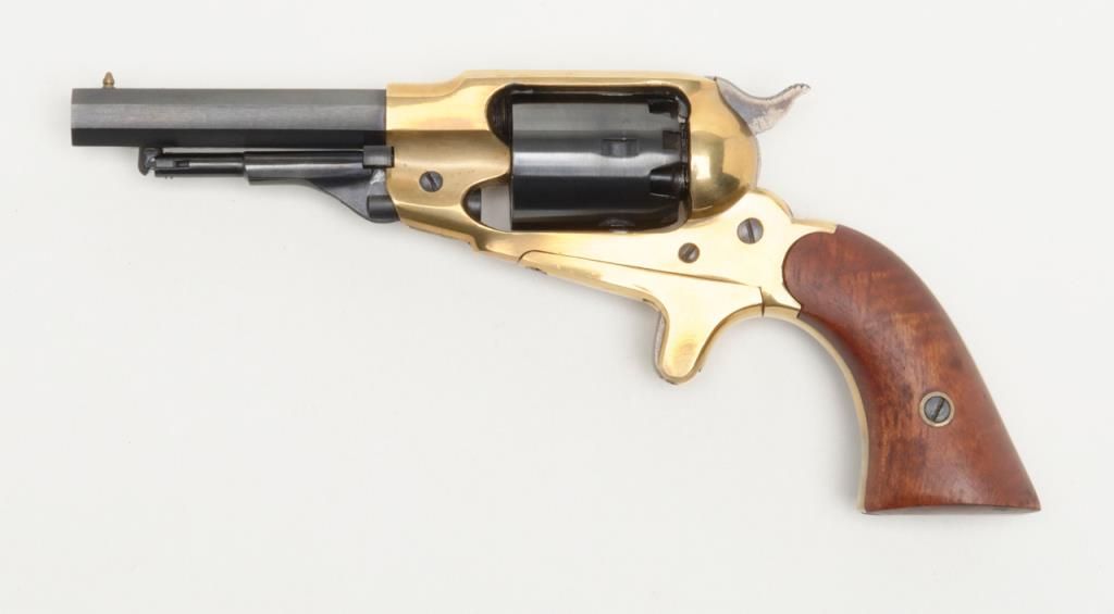 CVA reproduction percussion Remington New Model Pocket revolver, .31 cal., 3-1/2” octagon barrel, blue finish, brass frame, wood grips, #A9538 in like new condition showing little handling; with two piece cardboard box. (Exempt-reproductionpercussion). Est.: $100-$200.