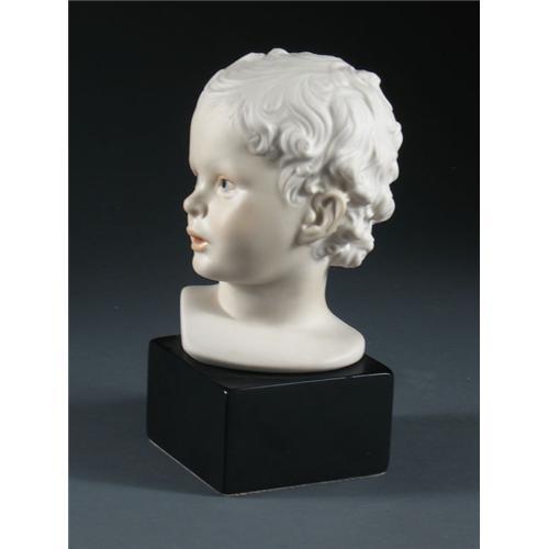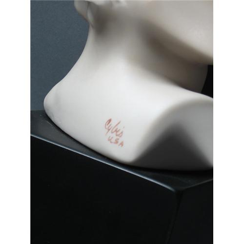 PORCELAIN: A handcrafted and hand decorated figurine by Cybis Porcelains, ''Eros Cupid Head'' with attached ebony colored stand, part of the Fantasia Collection, Design No. A23477, Signed ''Cybis USA'', Hallmarked ''Cybis 1974'', 1974'', 9 ¬'' H. Cybis is a recognized source of high-end porcelain hand decorated in the US. Note: Mint Condition.