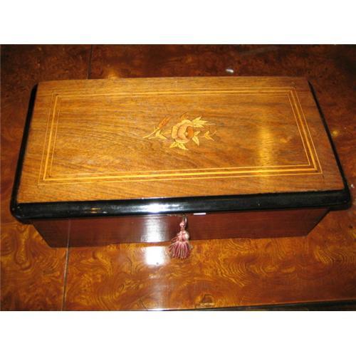 THE MUSIC BOX HAS BEEN REPINNED AND ALL THE TEETH ARE COMPLETEY INTACT AND STRAIGHT ON THE COMB. THE MAHOGANY CASE IS INLAID WITH A SATINWOOD ROSE WITH BOXWOOD STRINGING TO THE OUTSIDE EDGE. THE BEVELLED EDGE AROUND THE TOP OF THE BOX HAS BEEN BLACK LAQUERED. IT COMES WITH THE ORIGINAL KEY.