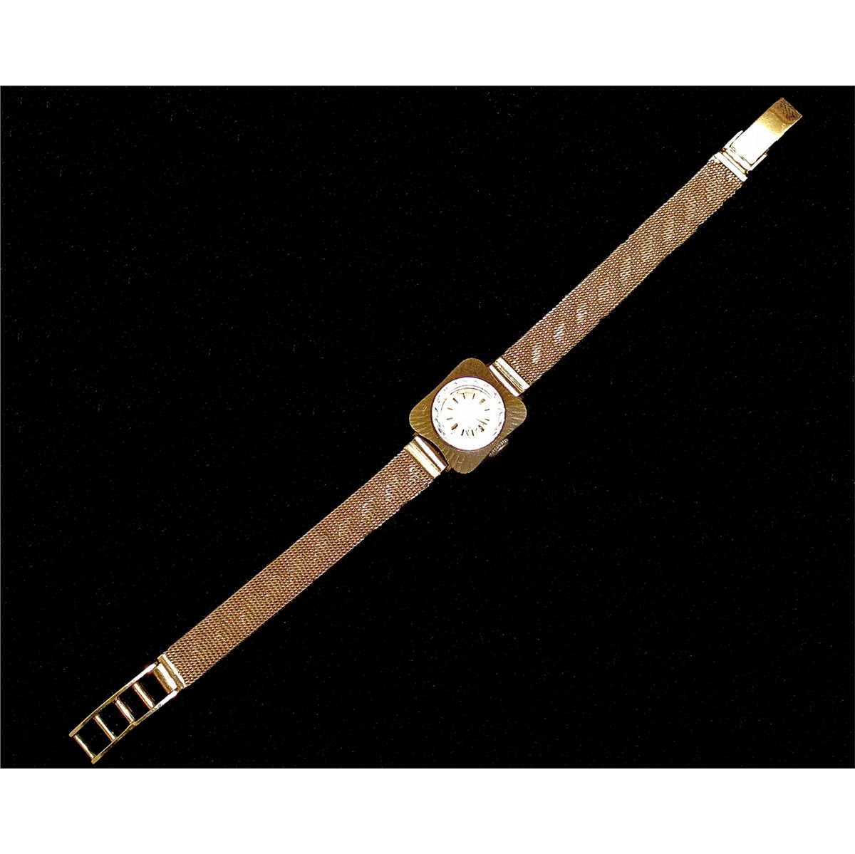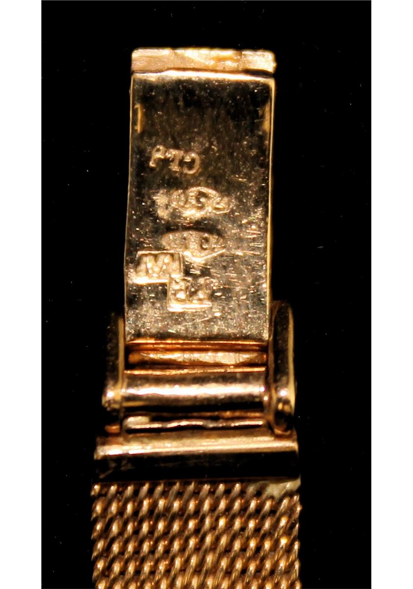 Swiss, 20th century. The shaped yellow gold case circular dial and 17 jewel movement, mounted with a 14K yellow gold strap. Length (open), 7.25 inches Total gold weight, 21 grams