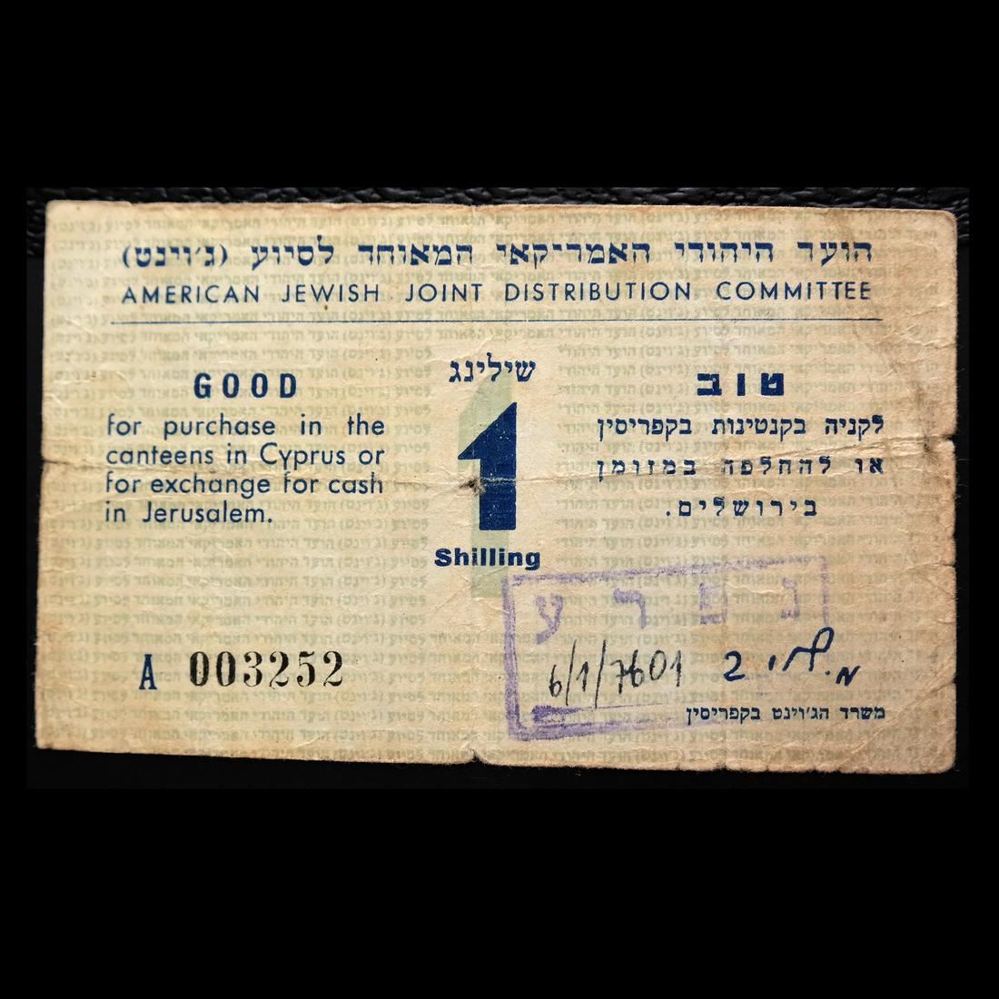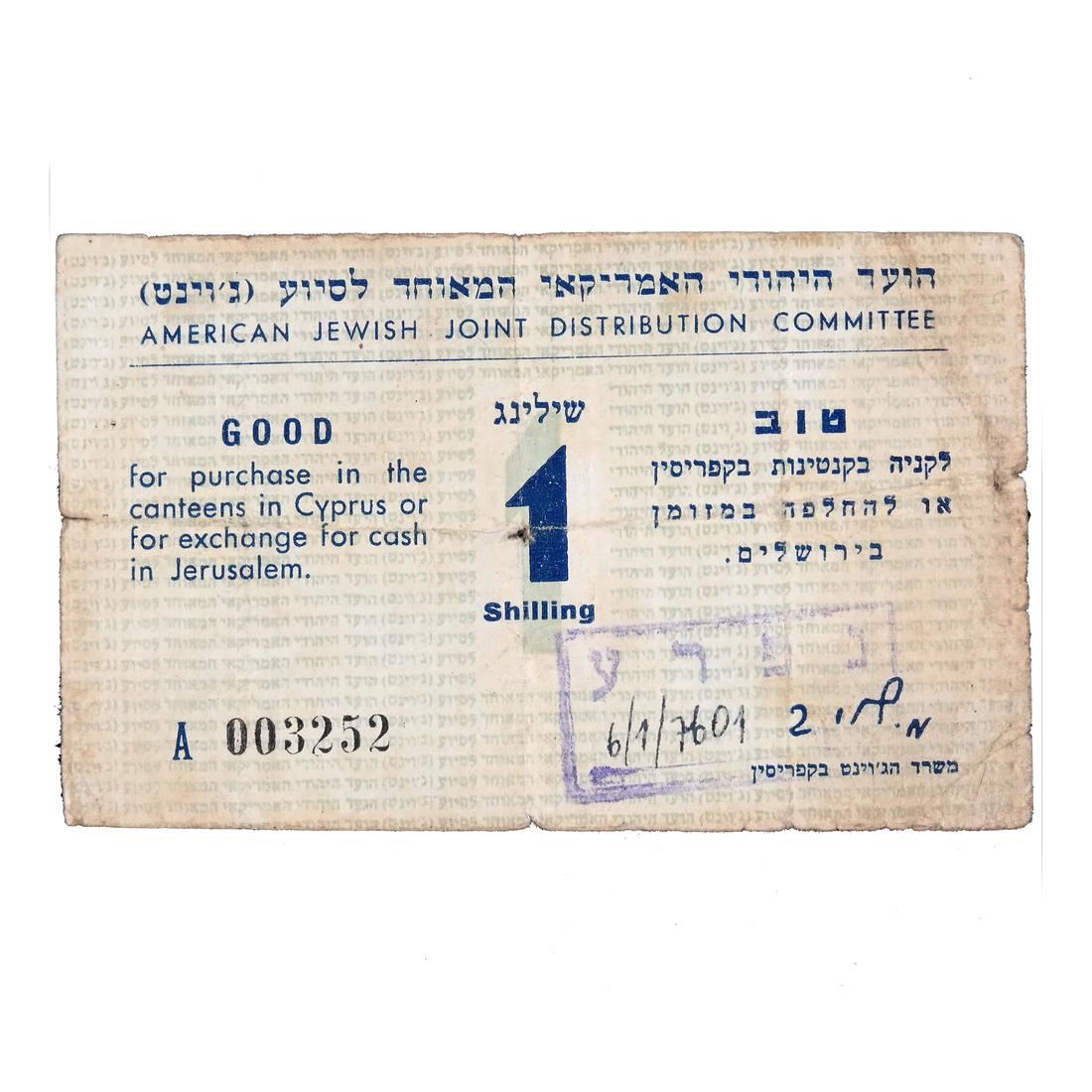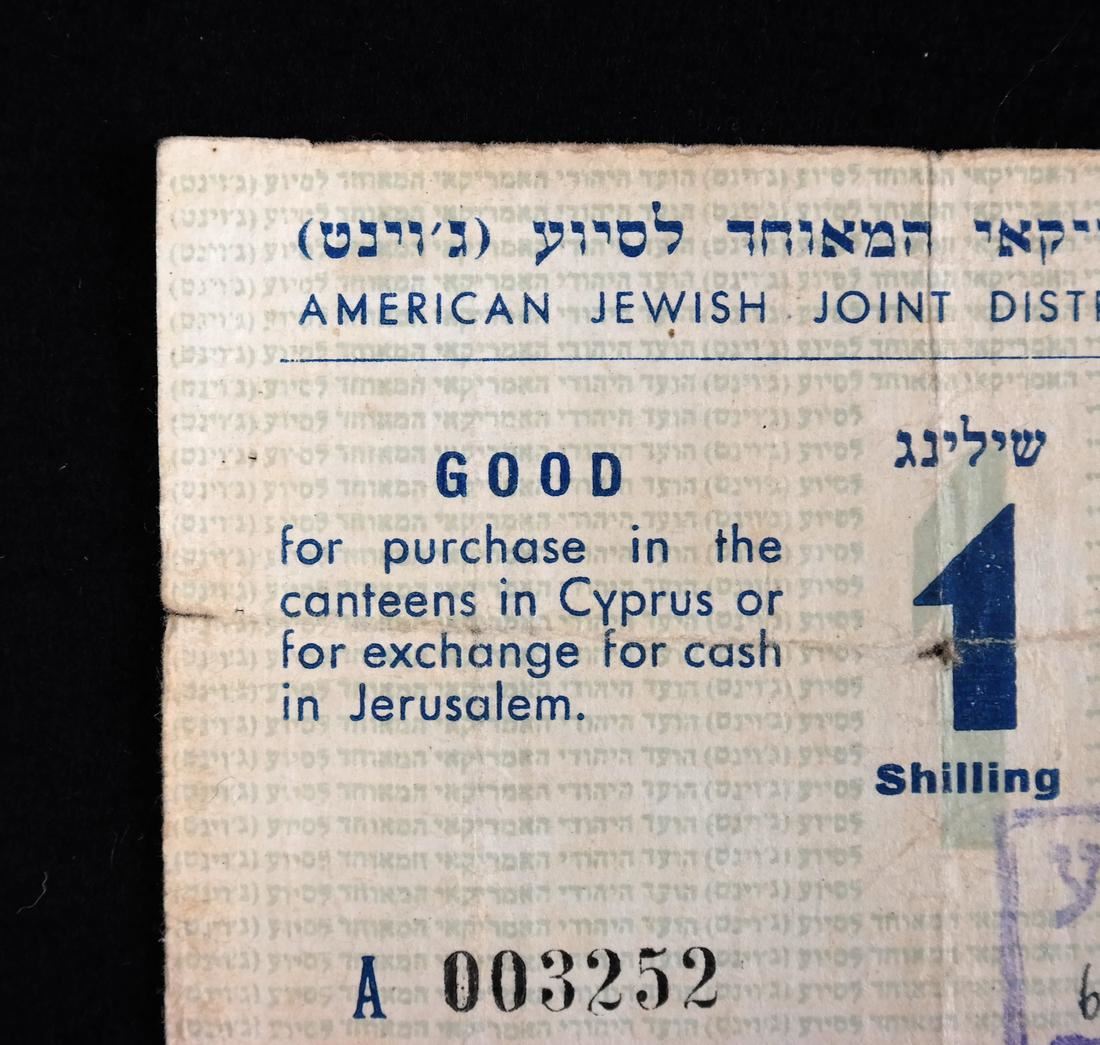 First issue, Good for purchase in the canteens in Cyprus or for exchange for cash in Jerusalem, serial #003252, violet boxed control handstamp, folds, creases, small center hole, edge tears and light soiling, Fine.