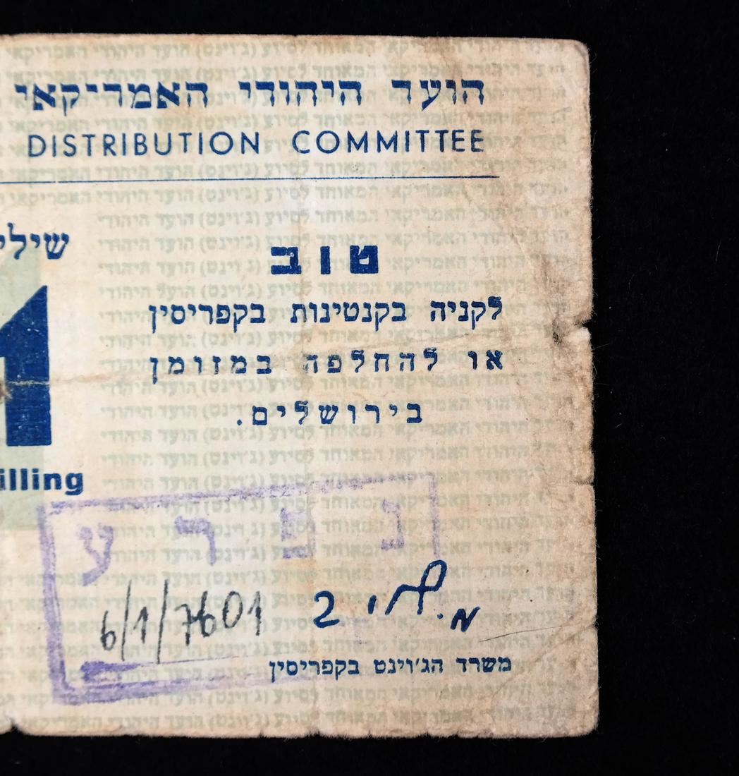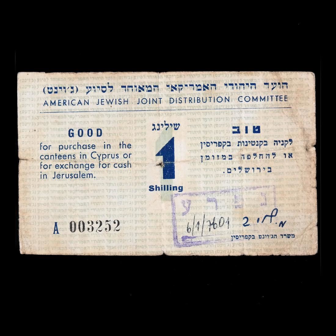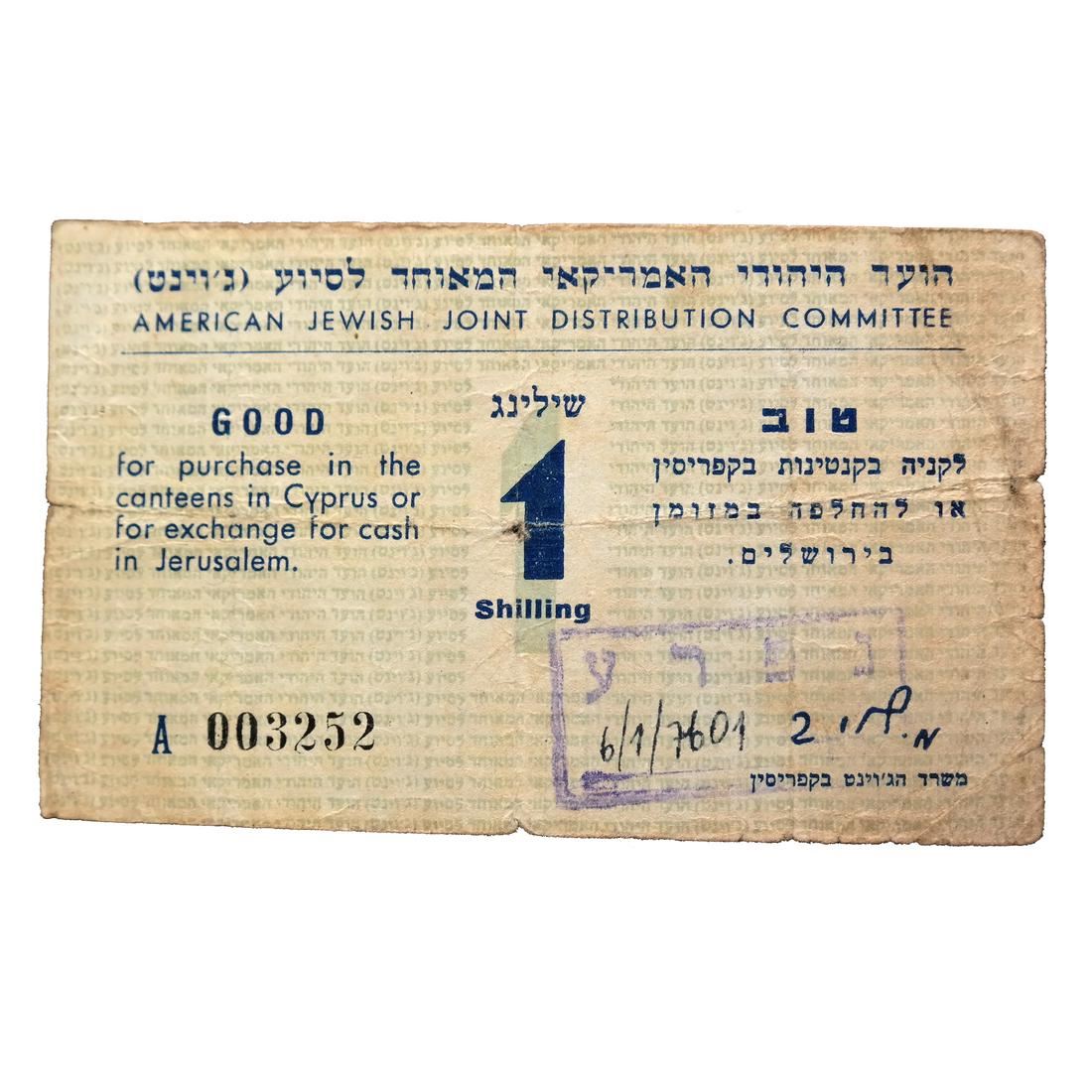 First issue, Good for purchase in the canteens in Cyprus or for exchange for cash in Jerusalem, serial #003252, violet boxed control handstamp, folds, creases, small center hole, edge tears and light soiling, Fine.