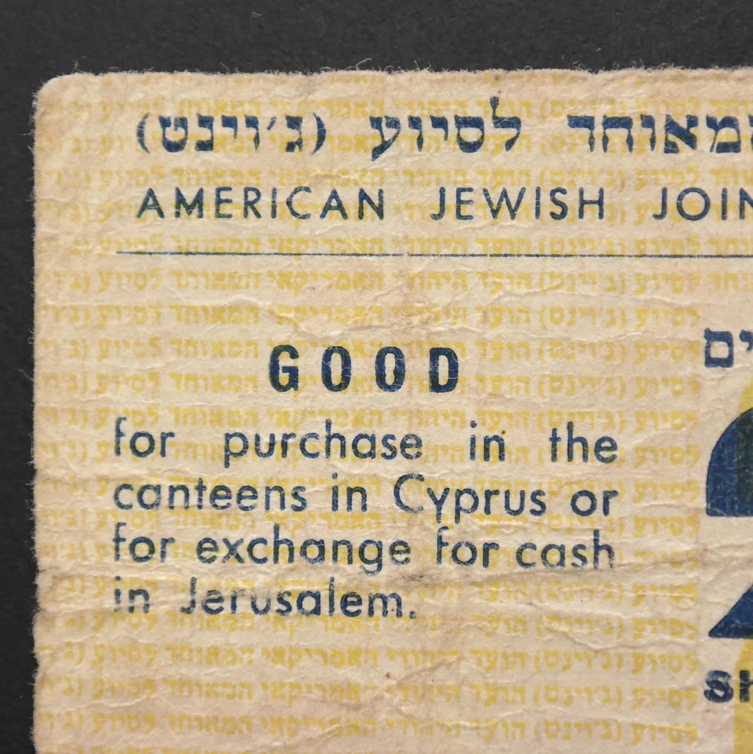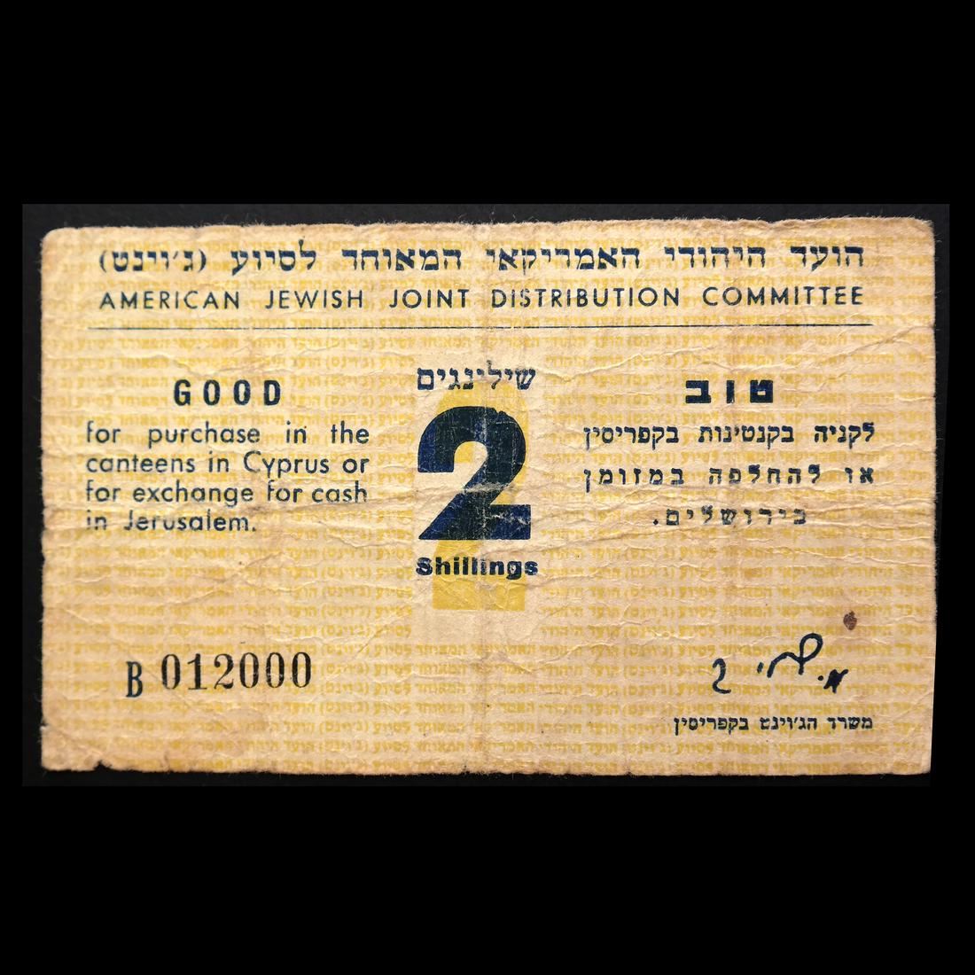 First issue, Good for purchase in the canteens in Cyprus or for exchange for cash in Jerusalem, serial #012000, folds, creases, small internal holes, edge tears and soiling, Fine.