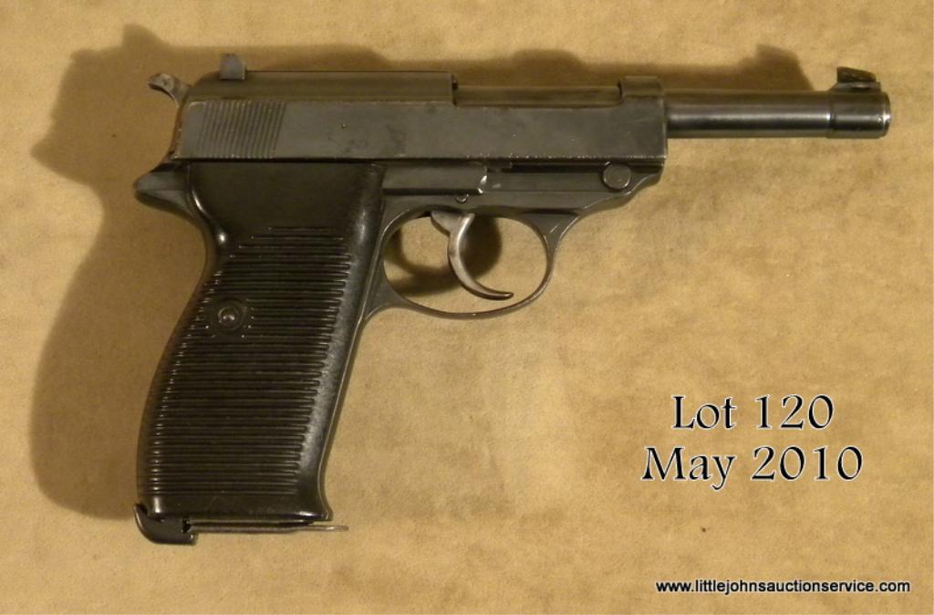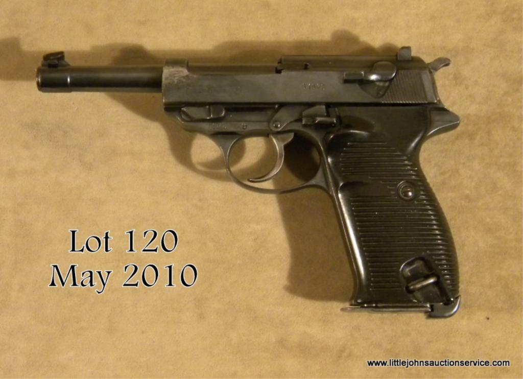 CYQ code Mauser P38, # 01048, 9mm, reblued finish, 5" barrel, bakelite grips. Pistol is in good condition overall, showing approximately 75-85% of an old refinish, with pitting under the new finish. Grips are in very good condition showingno chips or cracks, bore is good showing some corrosion and light pitting. Est. $200-$400.