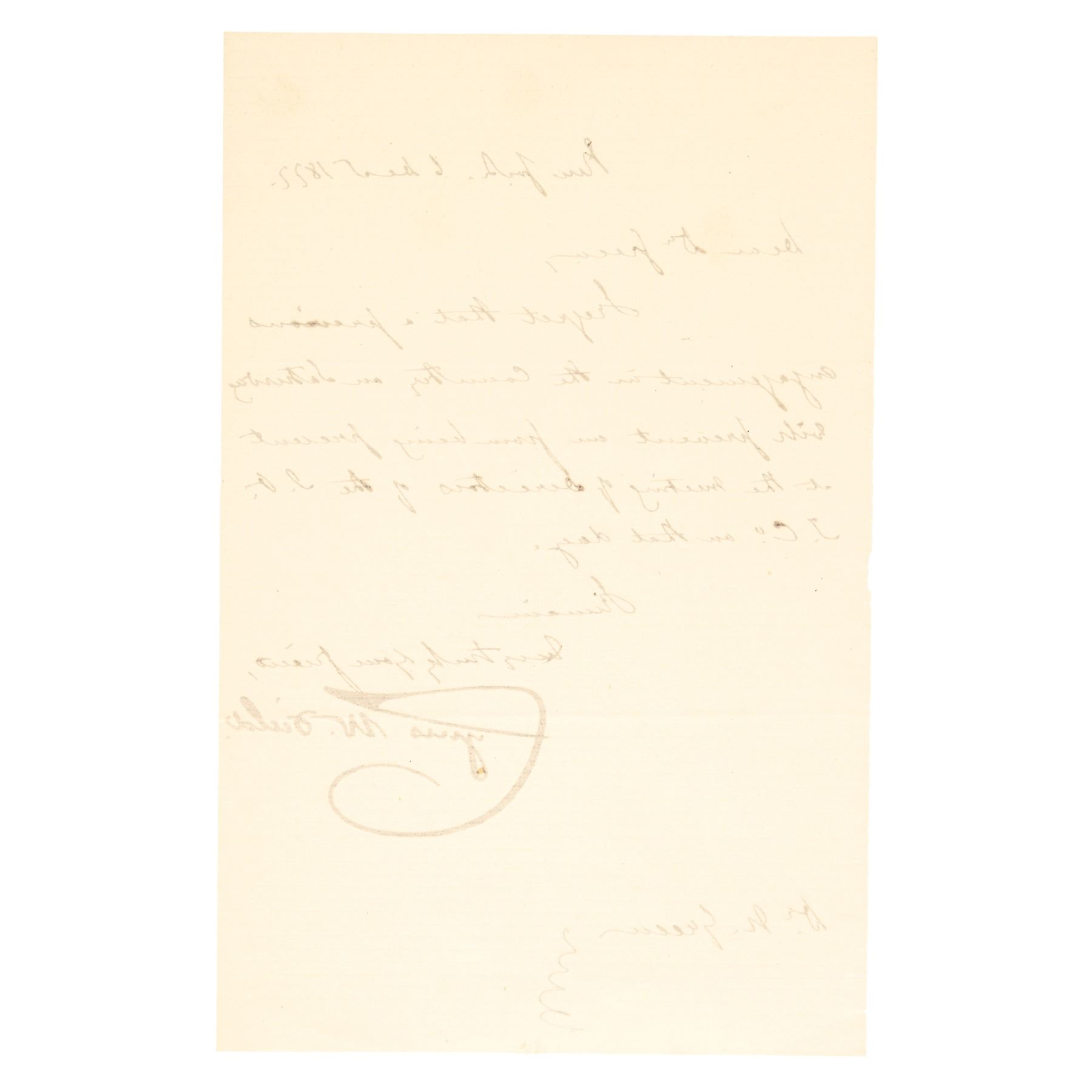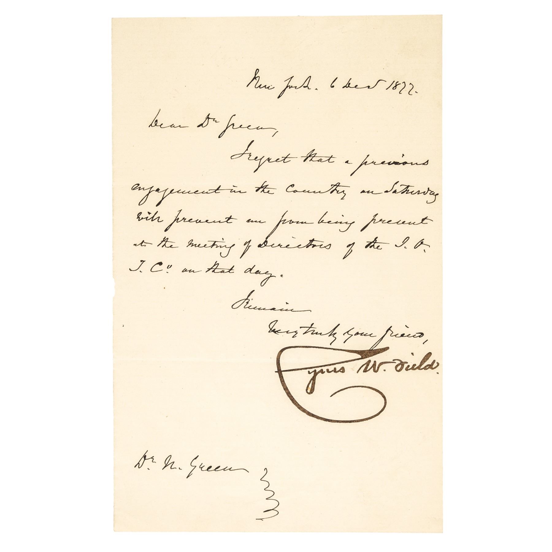 December 6, 1872-Dated Autograph Letter Signed, “Cyrus W. Field” addressed to a "Dr. Green", dated from 1872, 1 page, measuring 5.5” x 8.25" Choice Extremely Fine. His Letter is in regards to his being unavailable for a meeting due to a a prior engagement. The bold “Cyrus W. Field” Signature upon clean bright period paper that is extremely attractive and vivid for display.