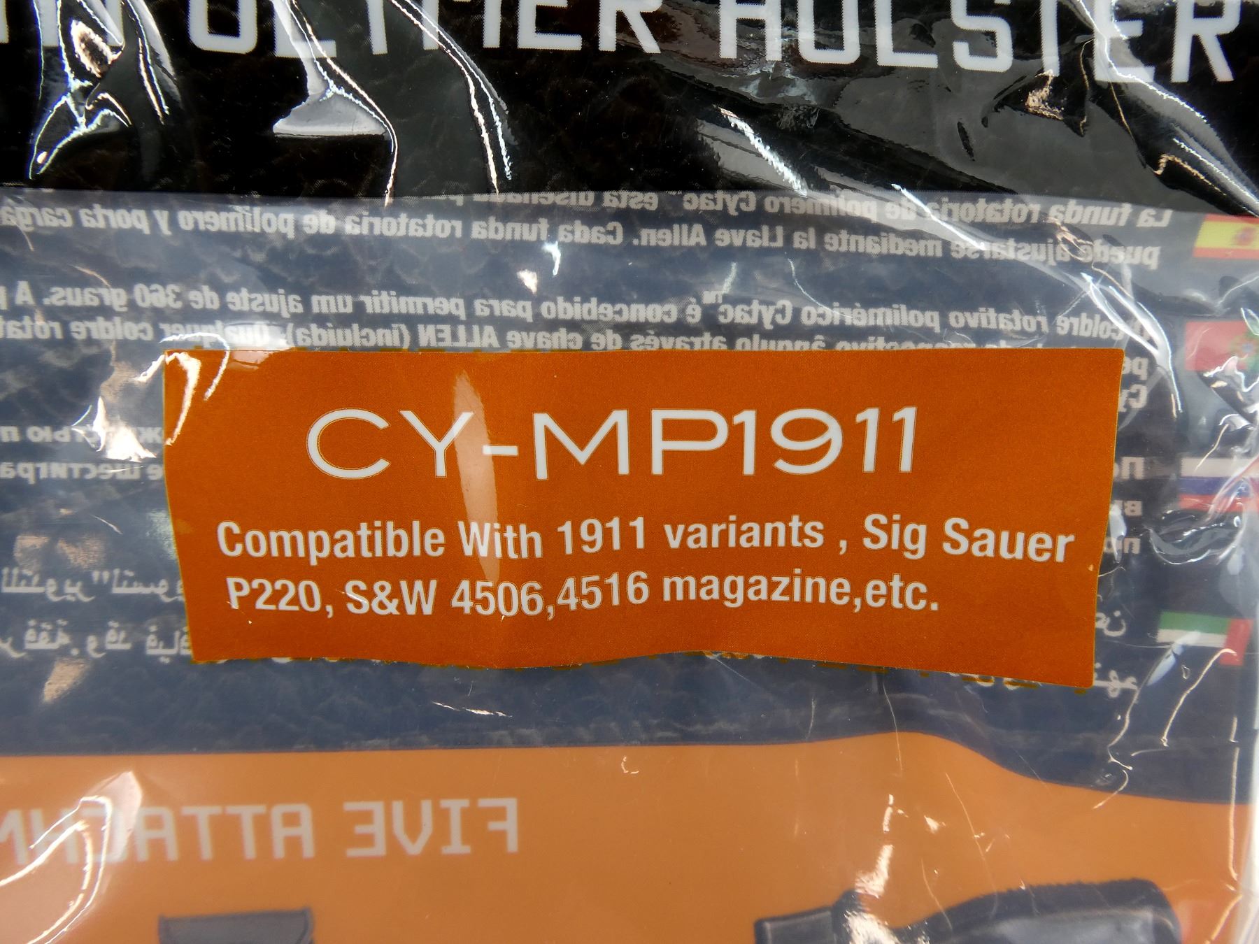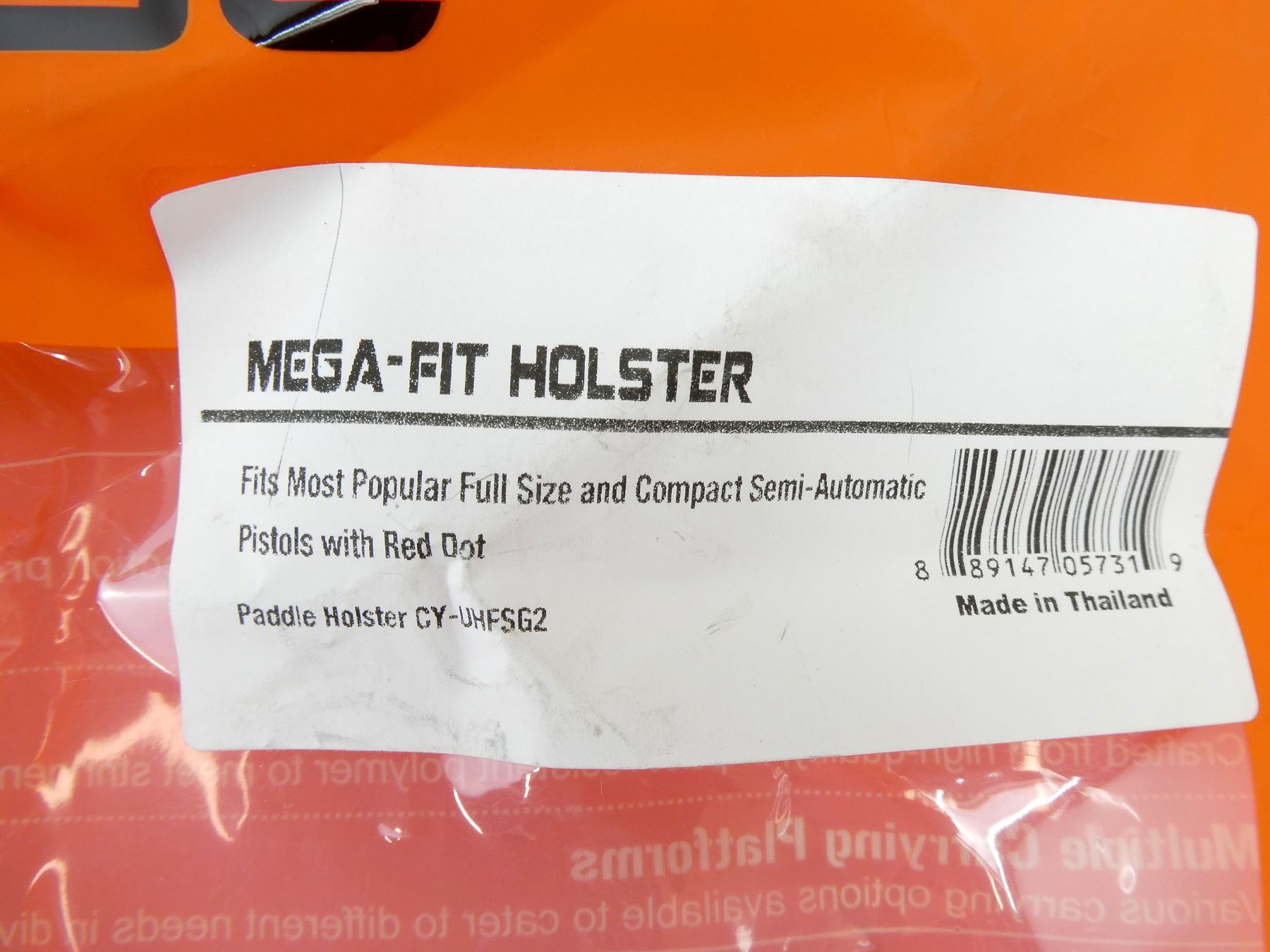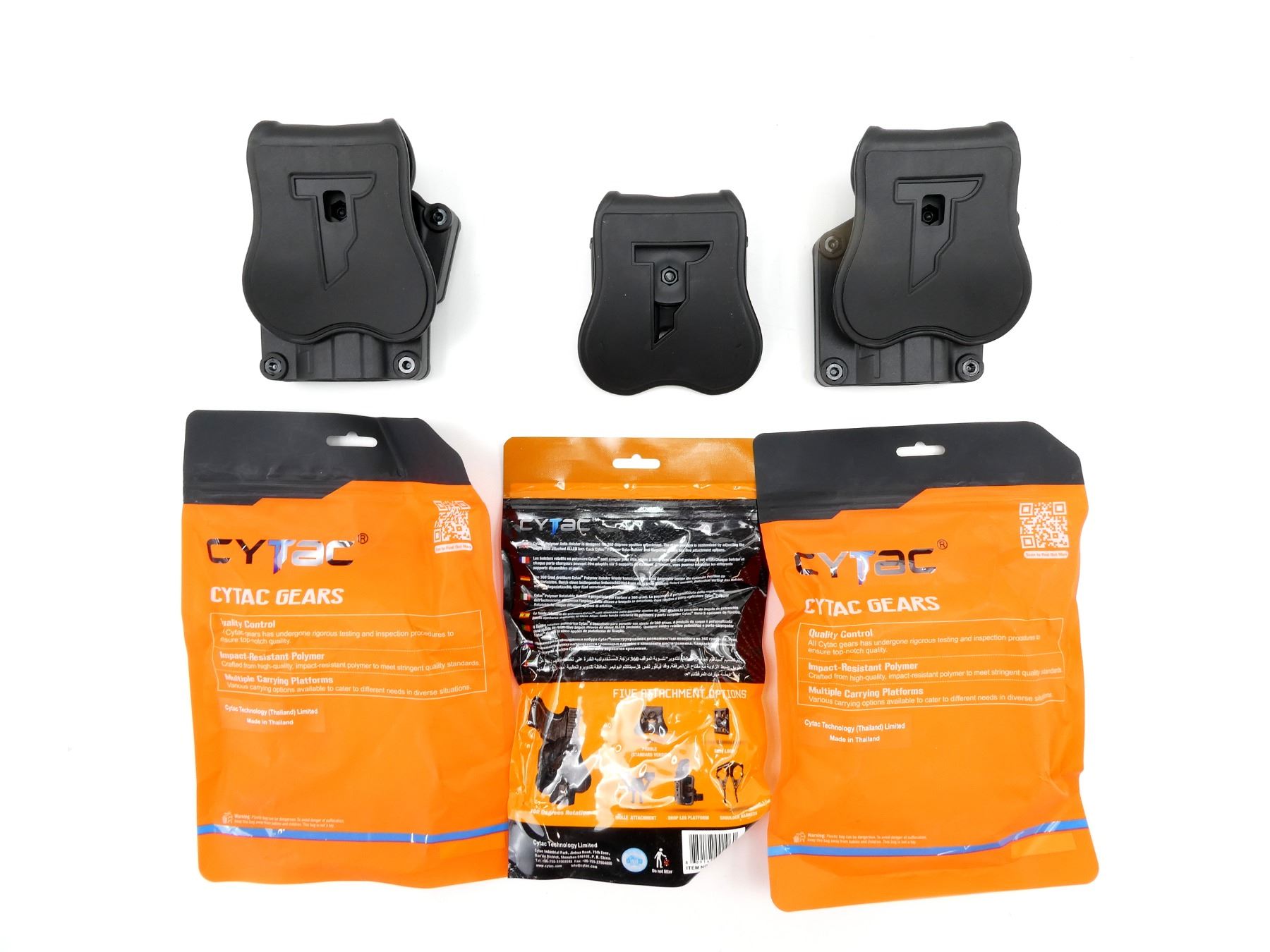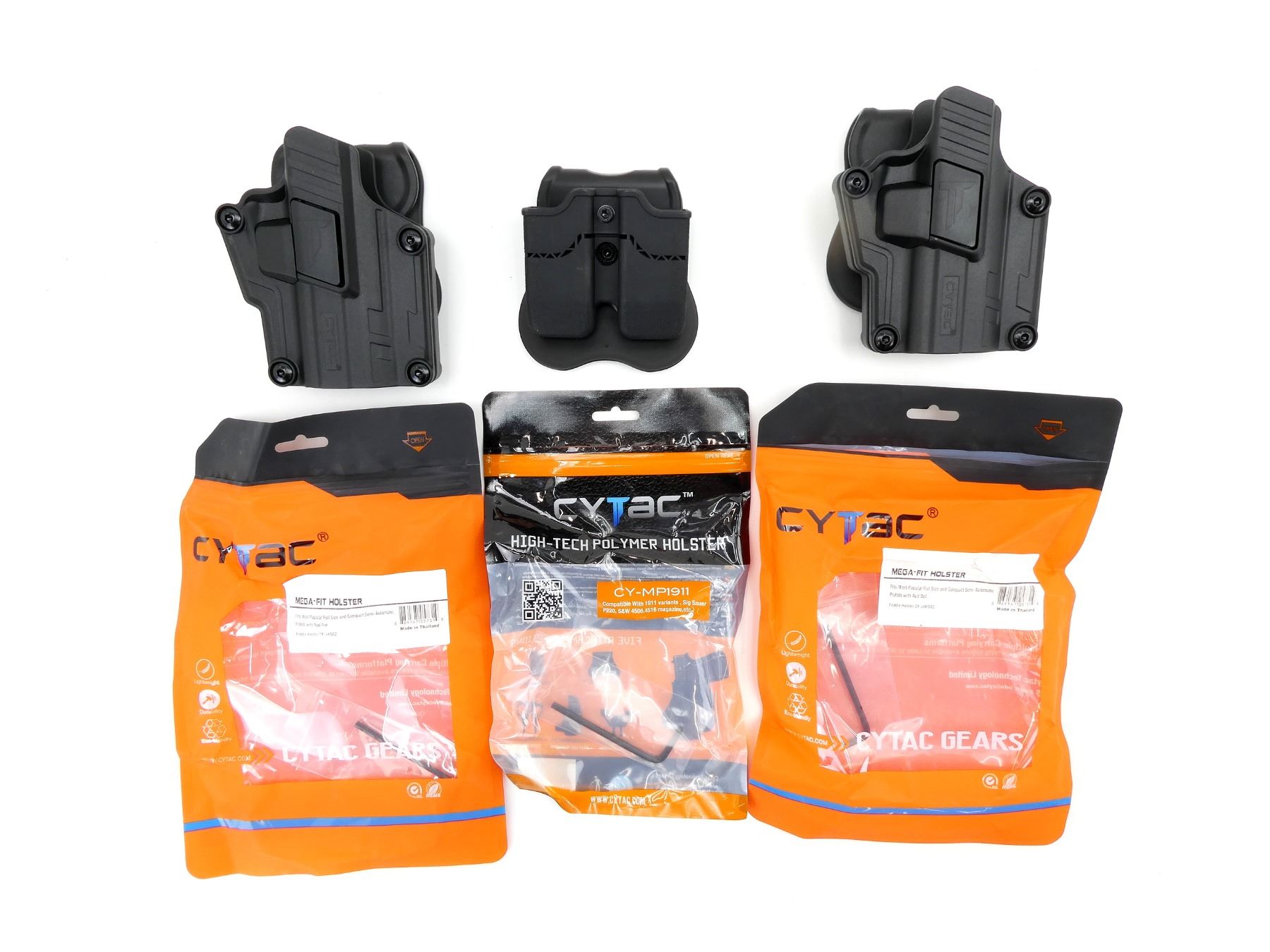 LOT INCLUDES; (2) CYTAC CY-UHFSG2 MEGA-FIT PISTOL HOLSTER, FITS RIGHT HANDED MOST FULL SIZE & COMPACT SEMI-AUTO PISTOLS WITH RED DOTS, BLACK POLYMER CONSTRUCTION, PADDLE STYLE, APPEARS NOS IN ORIGINAL PACKAGING & (1) CYTAC CY-MP1911 DOUBLE MAGAZINE POUCH, BLACK POLYMER CONSTRUCTION, FITS COLT 1911 VARIANTS / SIG SAUER P220 / ETC., APPEARS NOS IN ORIGINAL PACKAGING. SEE PHOTOS.