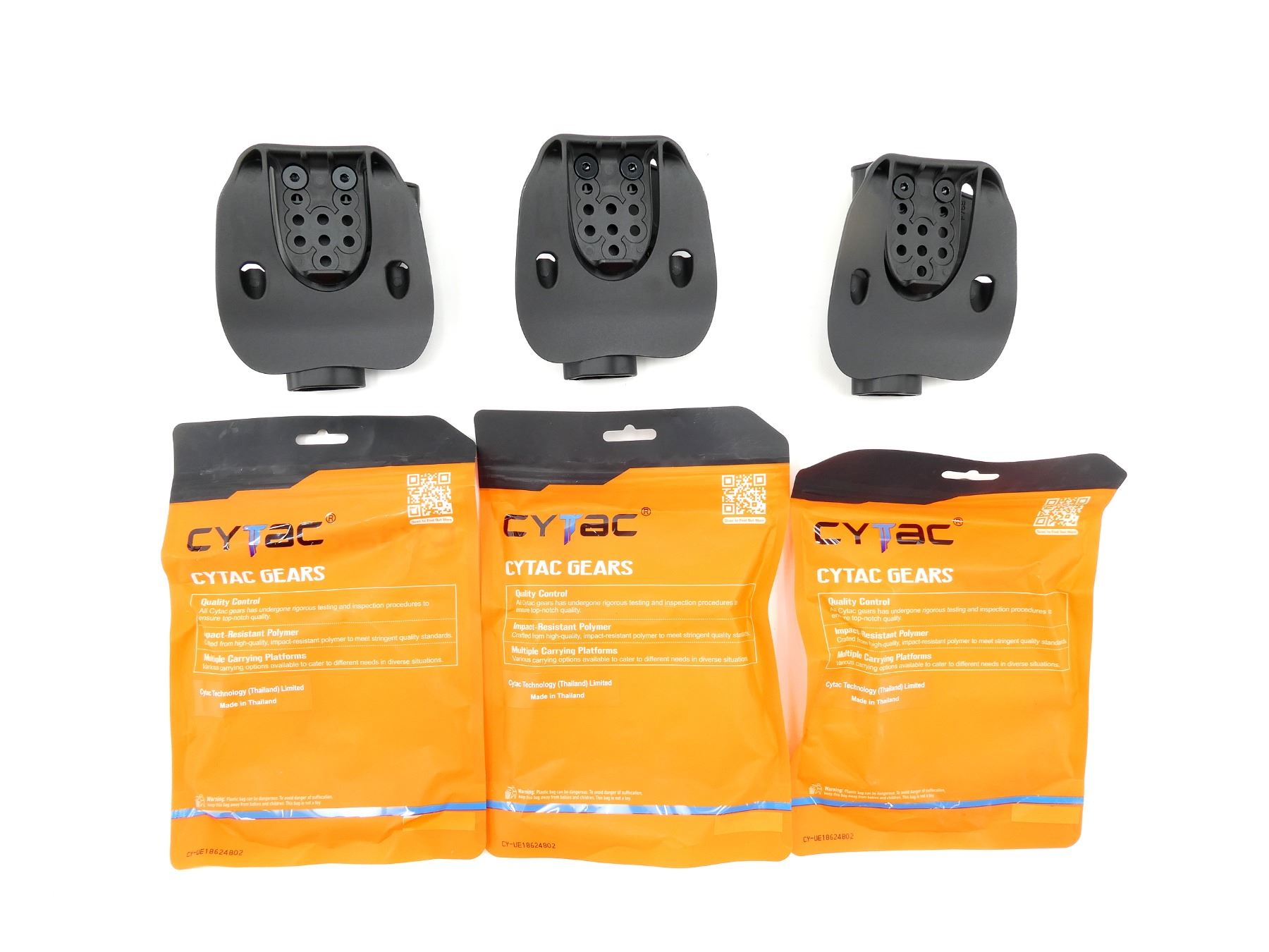 LOT INCLUDES; (3) CYTAC CY-F75B MEGA-FIT PISTOL HOLSTER, FITS RIGHT HANDED CZ 75 PISTOLS, BLACK POLYMER CONSTRUCTION, PADDLE STYLE, APPEARS NOS IN ORIGINAL PACKAGING. SEE PHOTOS.