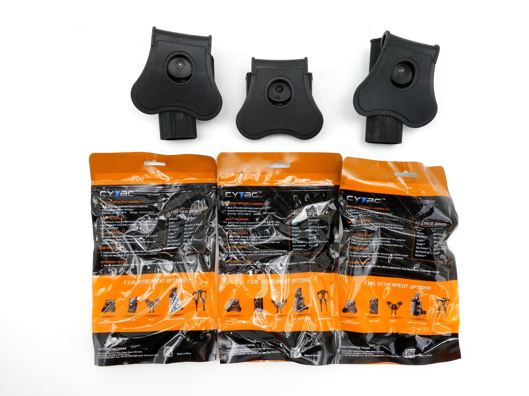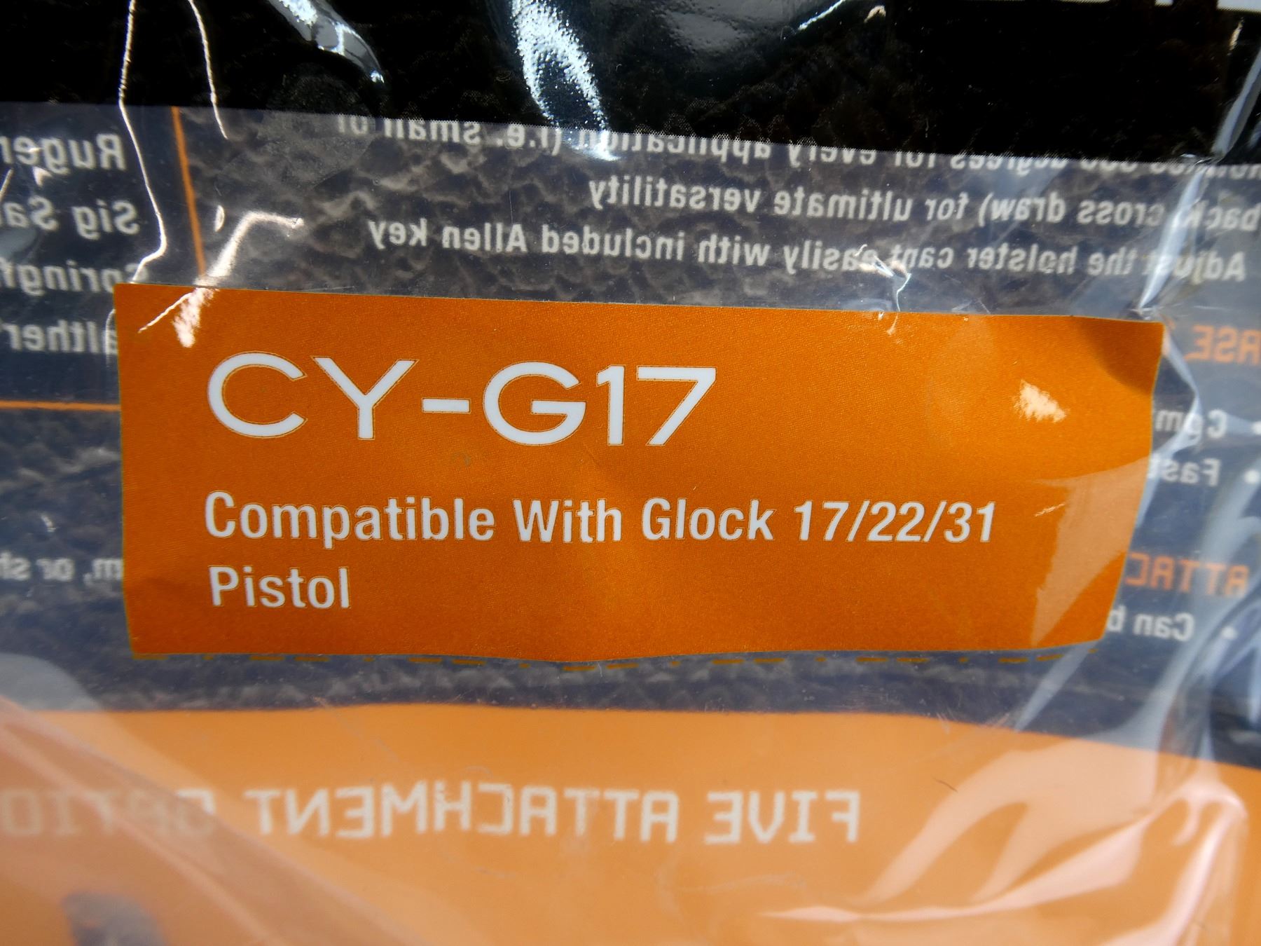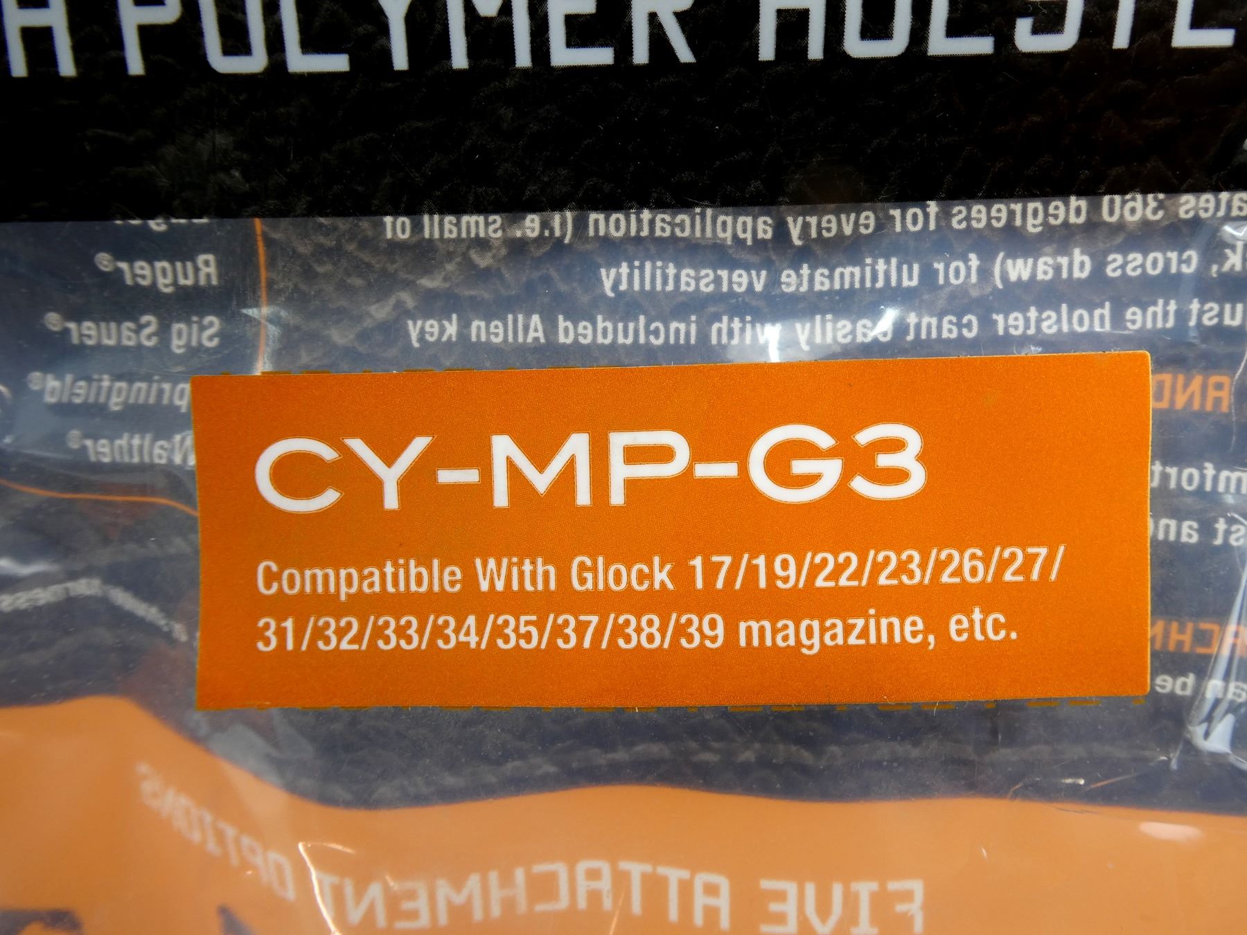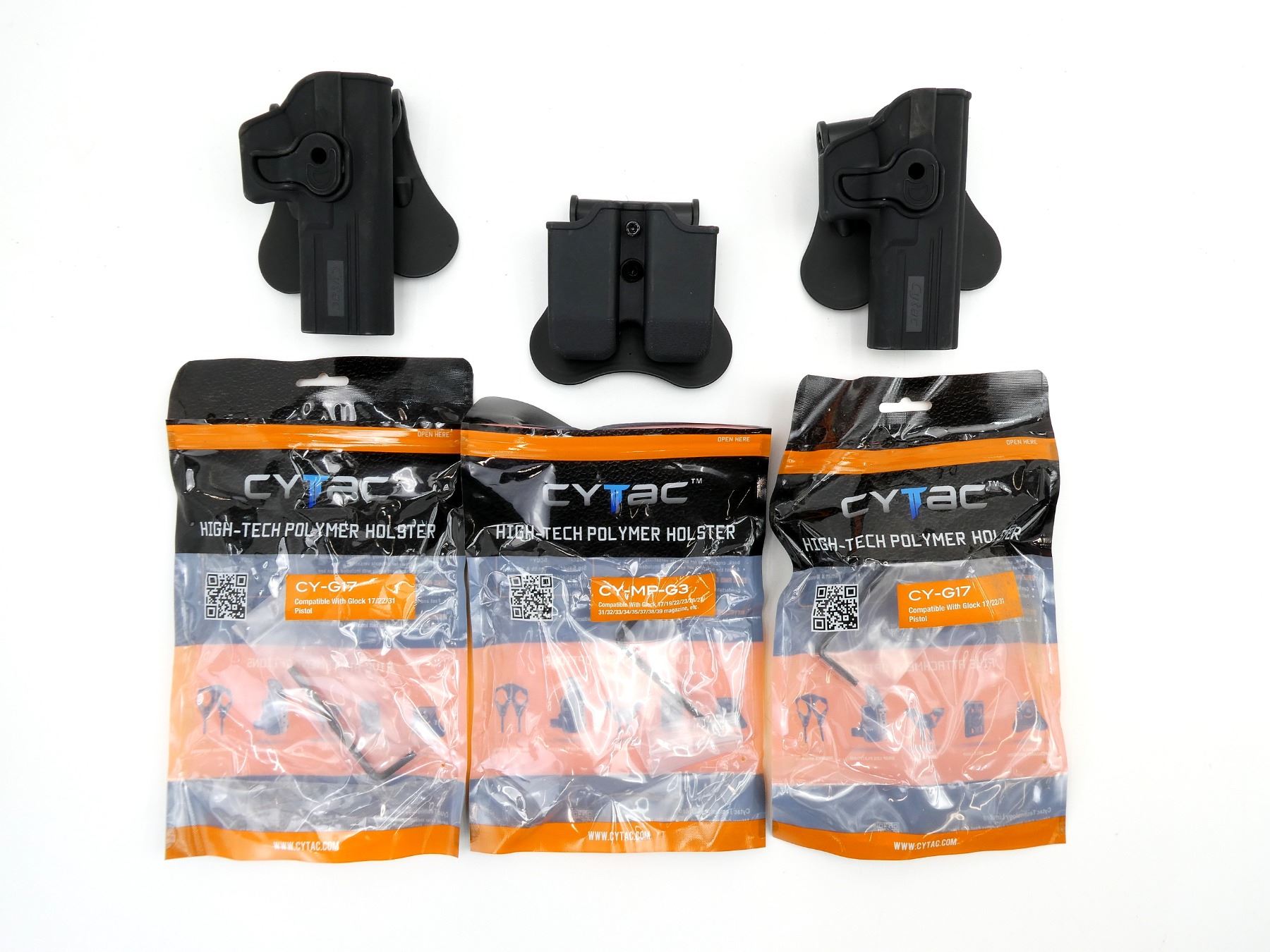 LOT INCLUDES; (2) CYTAC CY-G17 PISTOL HOLSTER, FITS RIGHT HANDED GLOCK 17 / 22 / 31 PISTOLS, BLACK POLYMER CONSTRUCTION, PADDLE STYLE, APPEARS NOS IN ORIGINAL PACKAGING & (1) CYTAC CY-MP-G3 DOUBLE MAGAZINE POUCH, BLACK POLYMER CONSTRUCTION, FITS GLOCK 17 / 19 / 22 / 23 / 26 / 27, ETC., APPEARS NOS IN ORIGINAL PACKAGING. SEE PHOTOS.