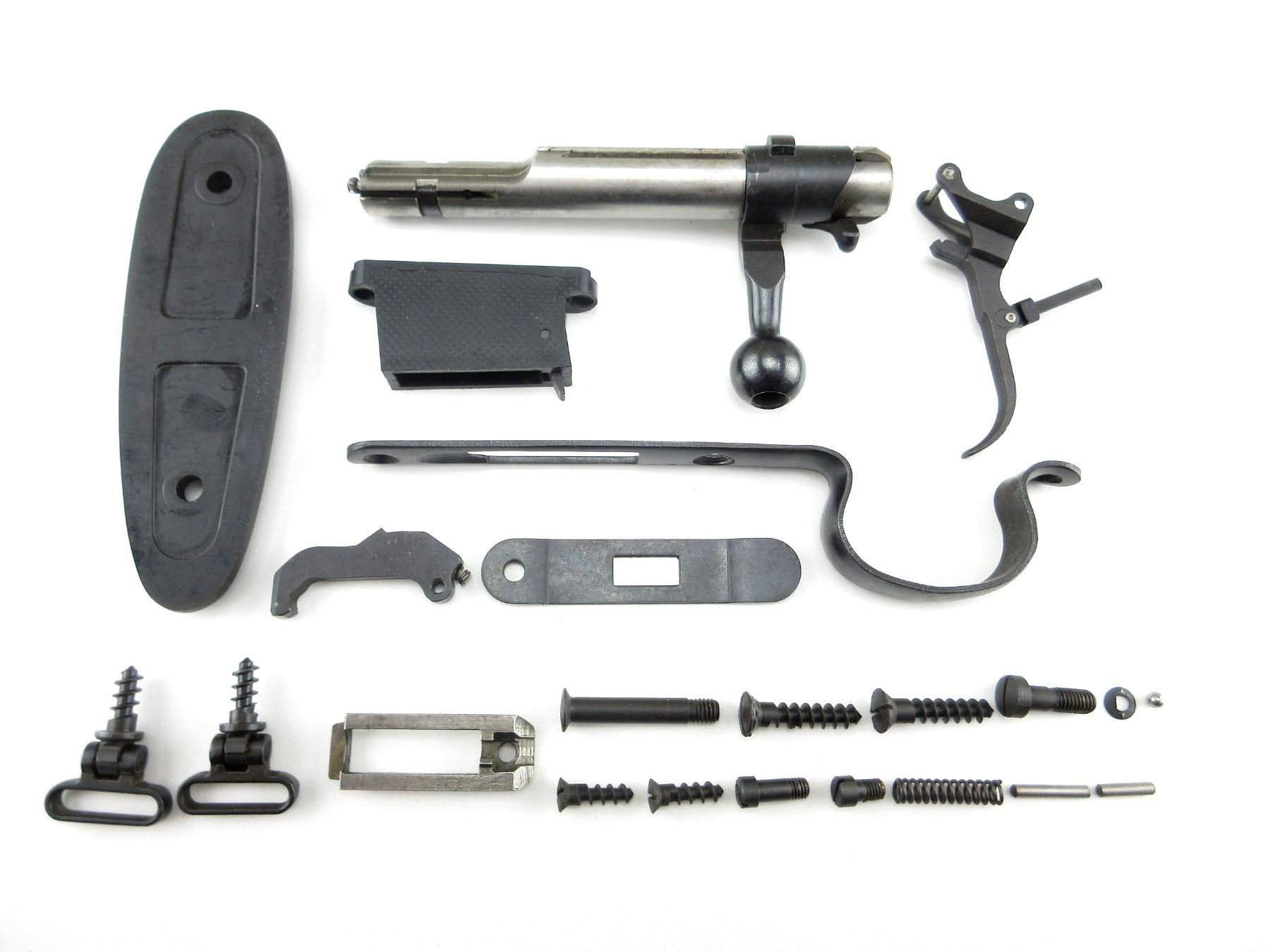 LOT INCLUDES; (1) BOLT, APPEARS COMPLETE, IN THE WHITE STEEL CONSTRUCTION, ASSORTED TRIGGER PARTS, POLYMER MAG WELL, EJECTOR BLOCK, TRIGGER GUARD, BUTT PLATE, VARIOUS SCREWS / PINS, ETC. MAY REQUIRE FITTING. SEE PHOTOS.