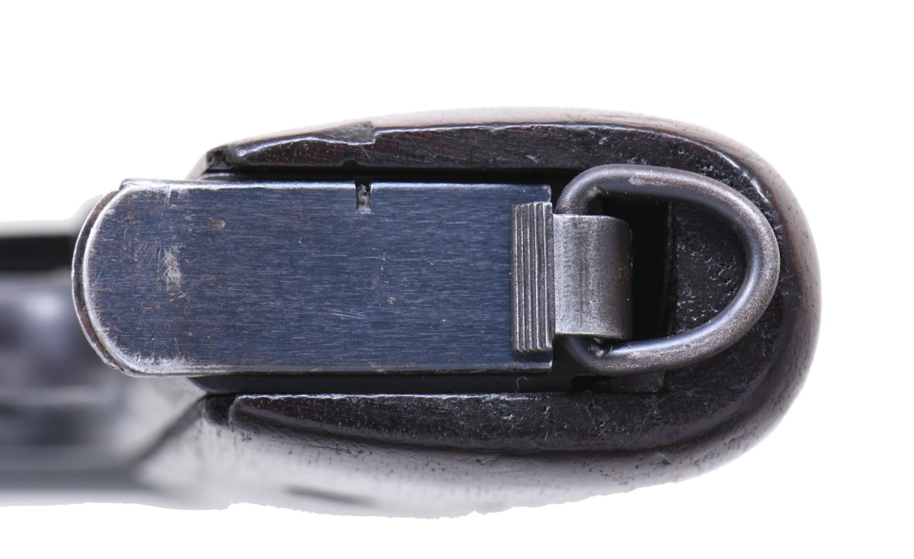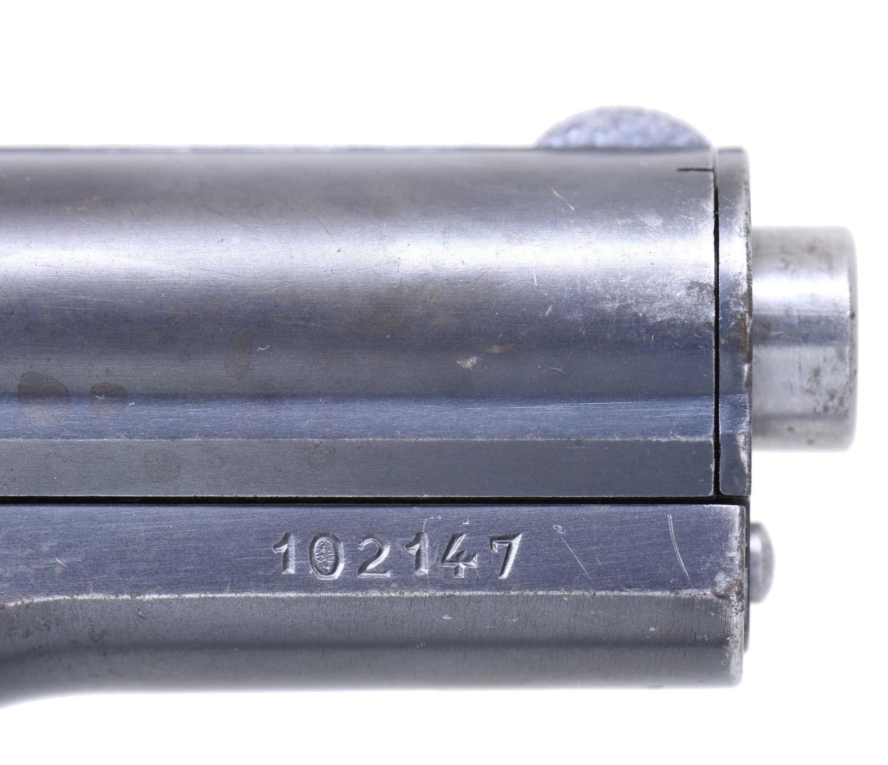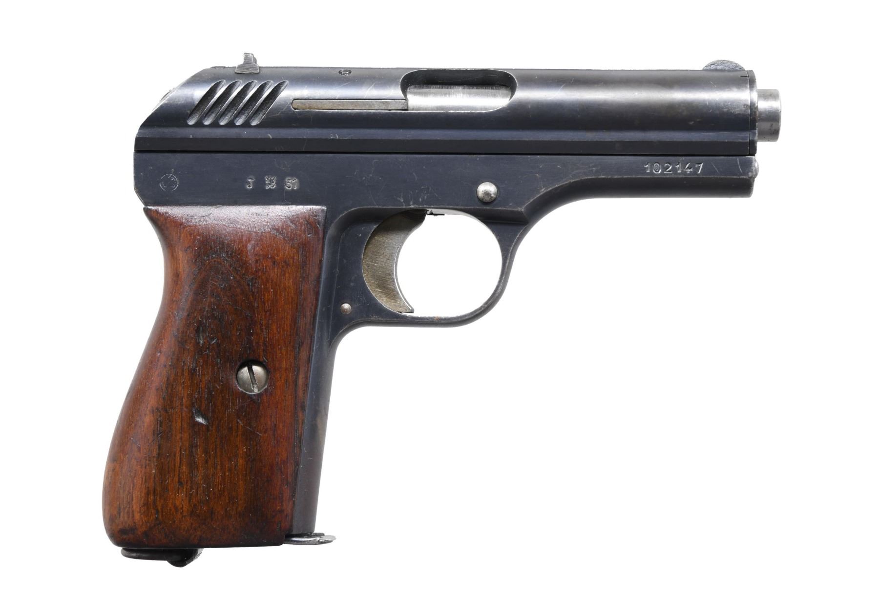 Cal. 9mm Kurz (380 ACP). S# 102147. Bbl. 3 5/8". Round blade front sight. V-notch rear sight. Matching numbers on slide & frame. Right side of frame has Czech lion marking with 31 date. Left side of slide has CZ logo with 30 date. Blued finish with strawed small parts. Smooth walnut grips. Lanyard ring present on bottom of grip frame. MAGS: 2-8 rd. UNATTACHED ACCESSORIES: aftermarket hardcase with leather Czech holster. CONDITION: grips show a couple tiny chips with scattered dings & handling marks. Metal retains 70% original blue with scattered edge wear, light oxidation & fading to gray. Action functions properly when hand cycled. Very good bright bore. (24-6874/MJC). CURIO. $400-600.