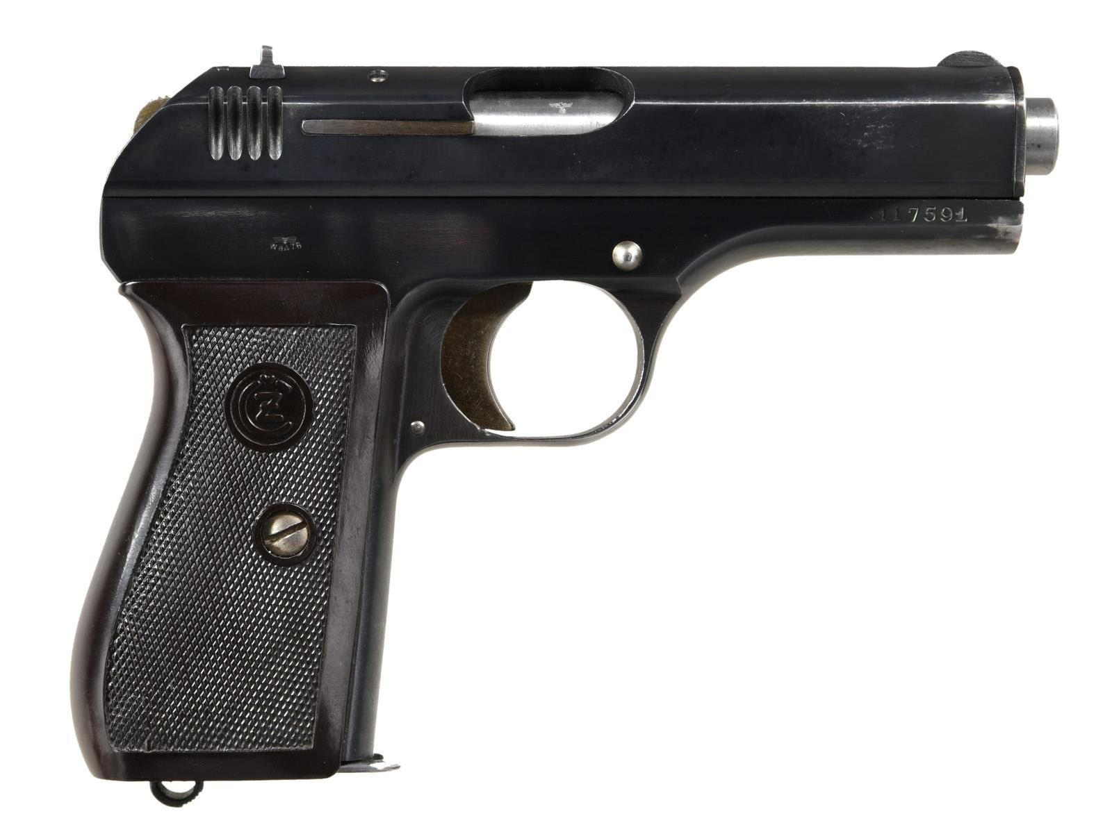 Cal. 7.65mm. S# 117591. Bbl. 3.8" Fixed blade front & notch rear sights. Polished blued finish w/ straw colored trigger. Nazi Waffenampt marked on Bbl., along w/ another Waffenampt "WaA/76" right side frame. Top of slide marked "BOHMISCHE WAFFENFABRIK AG IN PRAG". S#s match but the "11" on the right side of frame are very lightly struck. Brown checkered "CZ" logo grips. MAGS: 1-8 rd. factory. UNATTACHED ACCESSORIES: WWII brown leather hip holster "P MOD 27" dated "1941" & "CZ" logo along w/ Waffenampt "WaA/76". CONDITION: metal retains about 90% thinning finish. Grips show light marks. Bore is very good, bright & strongly rifled. (23-1437/CW). CURIO. $400-600.
