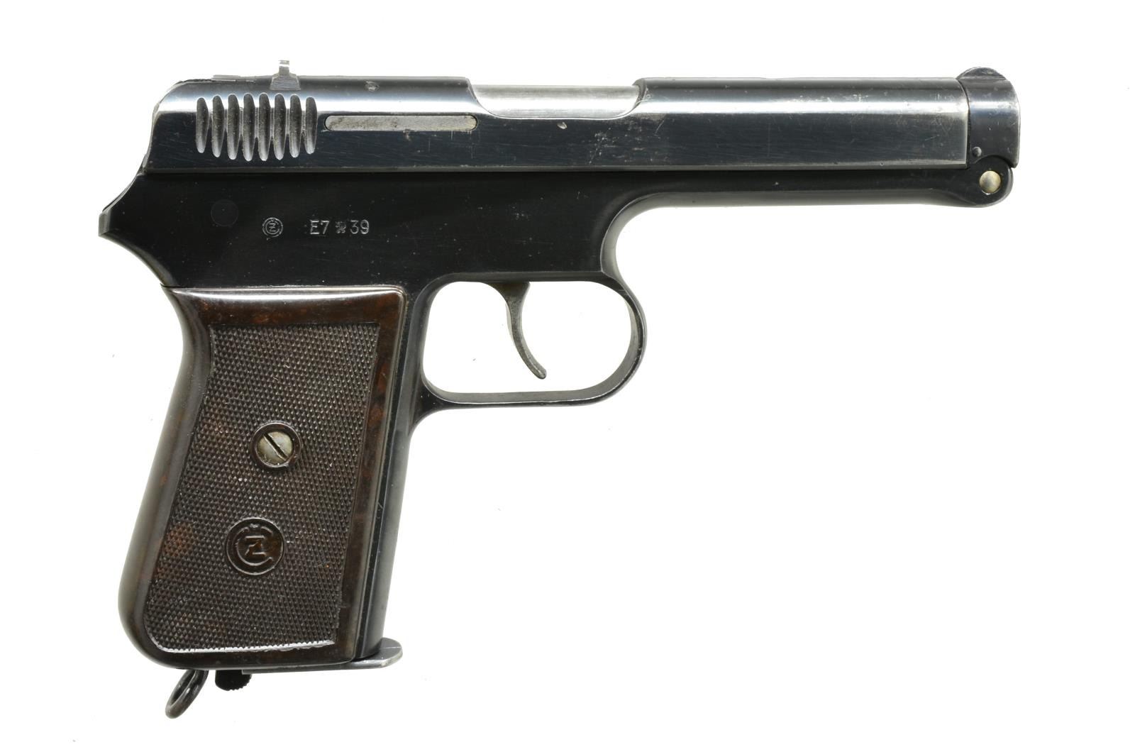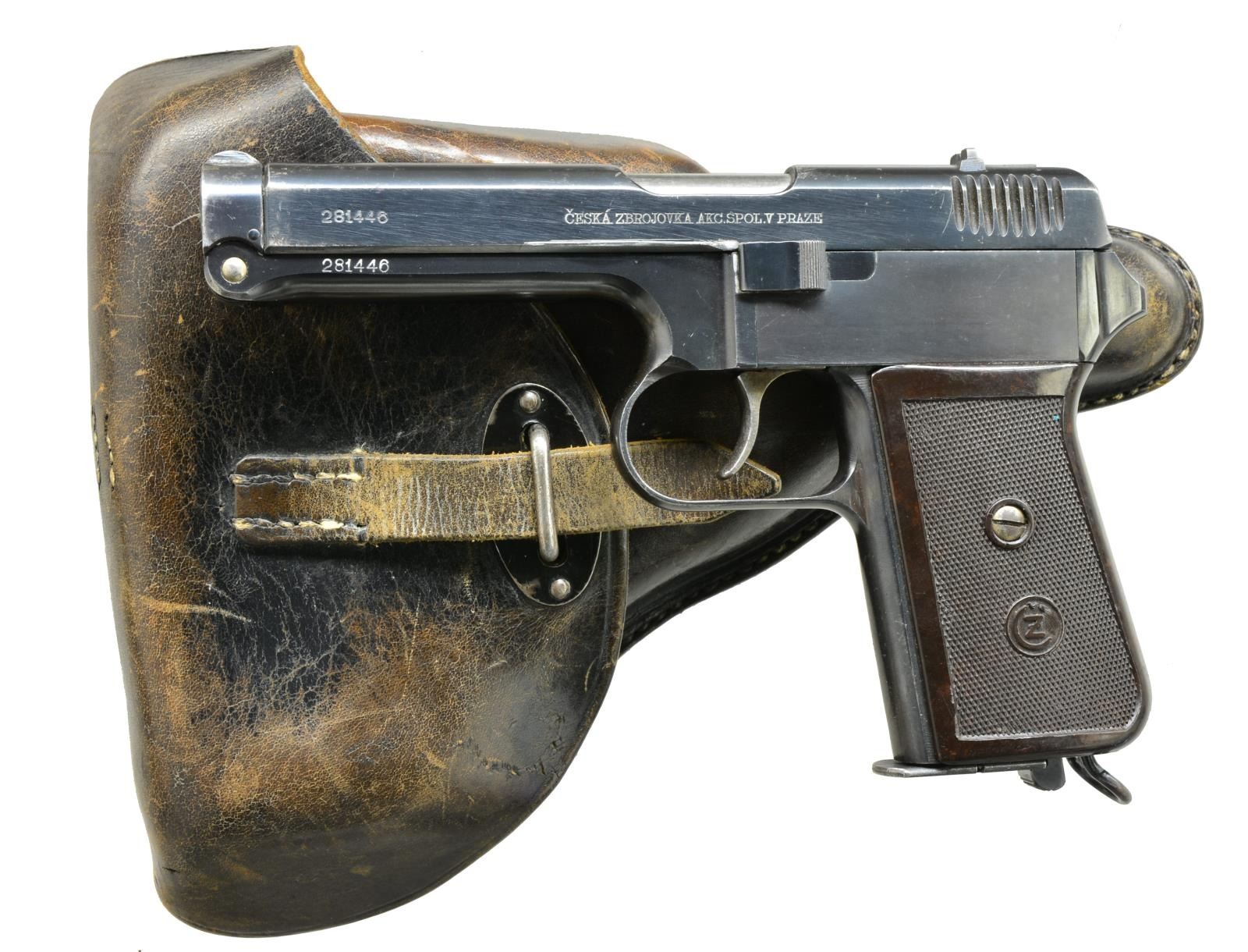 Cal. 9mm Kurz. S# 281446. Bbl. 4 3/4”. Mfg. in 1939. Over 44,000 Czech contract CZ 38s were procured for the German Army & the Luftwaffe. Like this pistol, the majority were not marked w/ the German acceptance stamps. The German occupied Czechoslovakia in March of 1939 prior to the pistols being issued. The Czech contract variation falls in the S# range of 250,000-291,000. High polish blue finish. Checkered CZ monogrammed wraparound grips. Lanyard ring. MAGS: 1-9 rd refinished mag. UNATTACHED ACCESSORIES: black leather “P39T” marked German DLWP 1940 date holster. CONDITION: overall very good blue showing holster, muzzle & high edge wear. Left side of slide has a scratch under address. Scattered handling marks & faint scratches present. Very good grips have a few scattered dings & handling marks. Very good bright bore w/ distinct rifling. Very good holster shows high edge wear & crinkling at flap fold w/ scattered scuffs & handling marks. (20-3353/ZAL). CURIO. $1,000-1,500.
