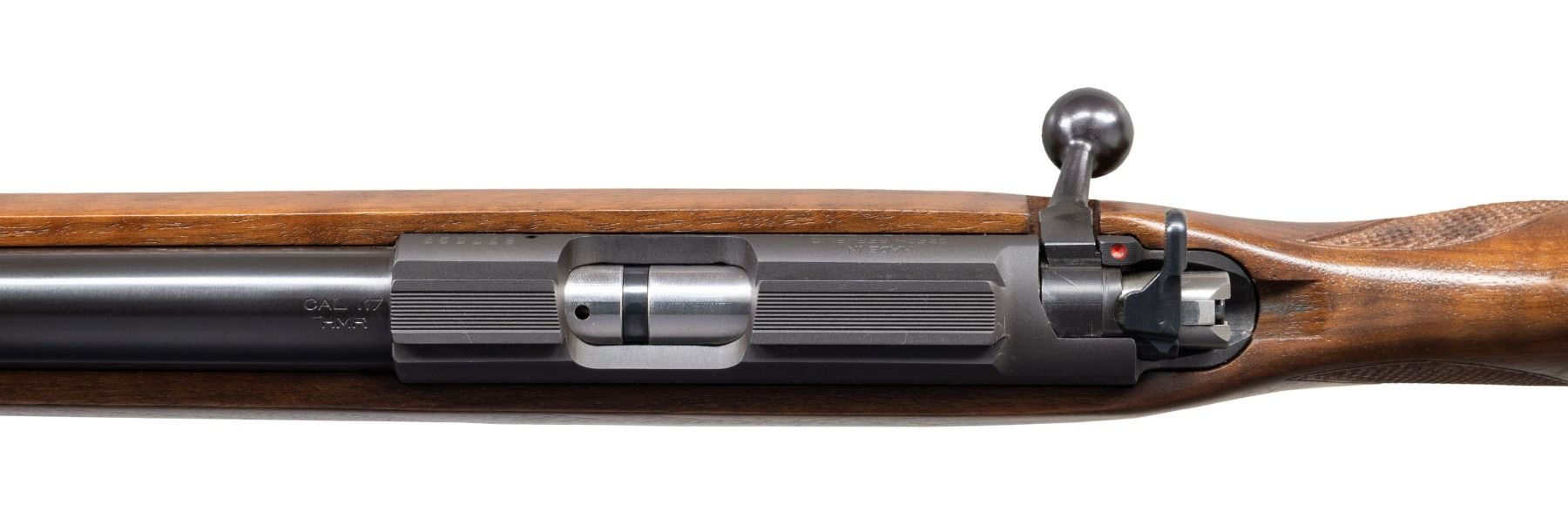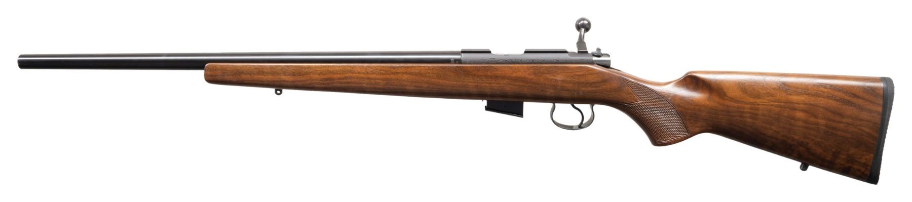 Cal. 17 HMR. S# 877029. Bbl. 21". Reciever is grooved for scope mounting. 2003 made CZ-452. Blued finish. Checkered pistol grip walnut stock with bottom mounted sling studs & Pachmayr recoil pad. MAGS: 1-5 rd. UNATTACHED ACCESSORIES: matching numbered factory box with manual & paperwork. CONDITION: stock shows a few handling marks. Metal retains nearly all its original blue with a couple light handling marks. Bright near excellent bore. (24-3042/MJC). MODERN. $500-750.