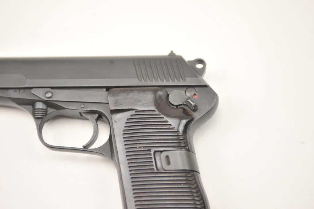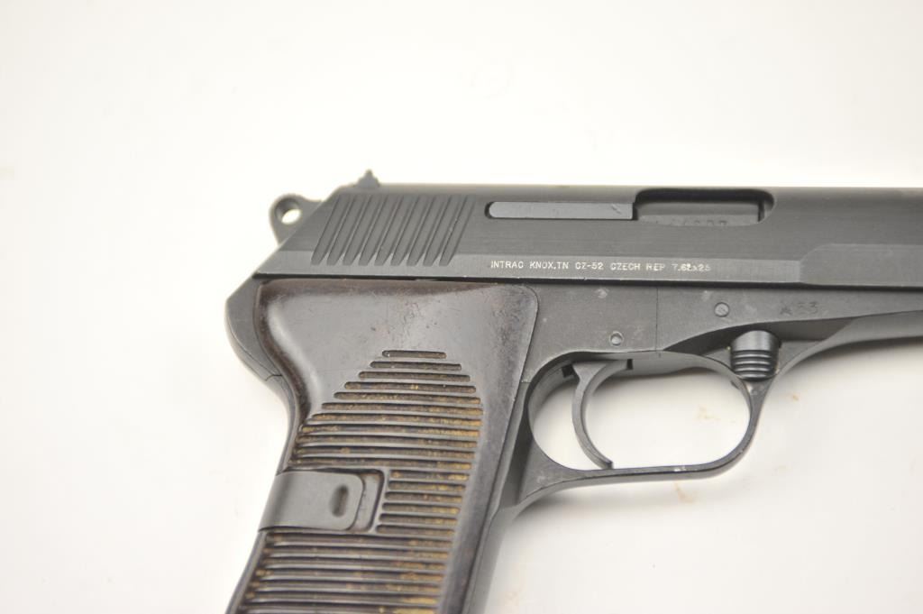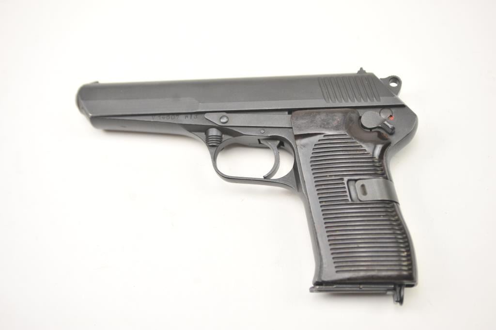 CZ-52 Semi-Auto Pistol in 7.62 Tokarev caliber, S/N V14607 and “NID” maker code marked. 1953 dated. Matching barrel. 95%-98% dull matt military finish remaining with very good grips showing minor holster wear.Mechanically sound with bright bore. Import marked. (C&R/PPT) Est.: $250-$500