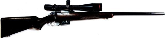 bolt action rifle, 24" barrel, blued finish, checkered walnut stock and Simmons 6X-20X-44 scope, remains very good overall, bedded action,sling swivels and rubber pad. Modern. Est. 500-750