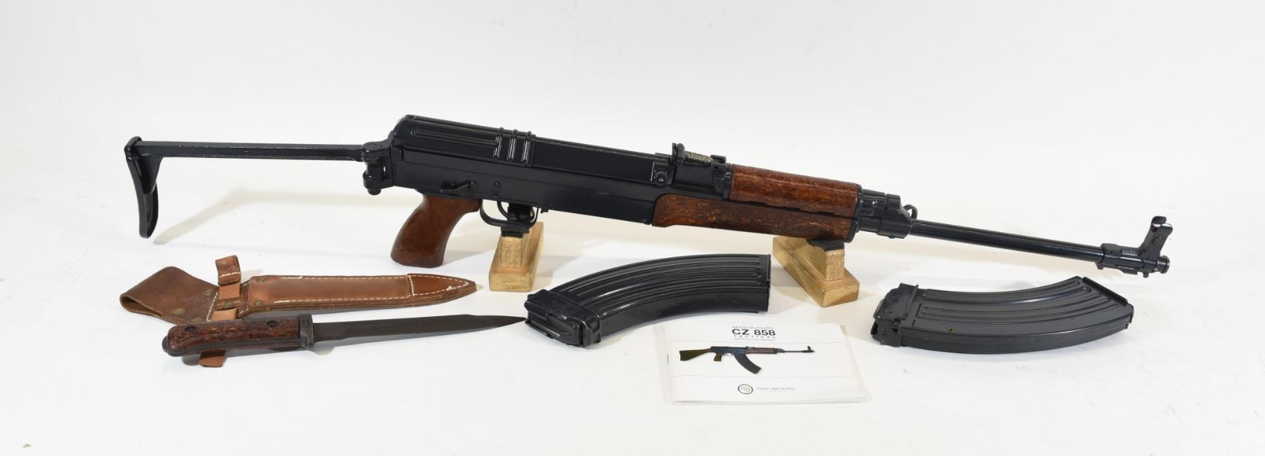 Non-Restricted, CZ 858 Tactical 2V Semi-Auto Rifle in 7.62x39. Wood stock has no noticeable scratches or dents. Has folding butt stock. Bluing is good. Bore is excellent. S/N A976484. Has 2 Magazines and Bayonet with sheath