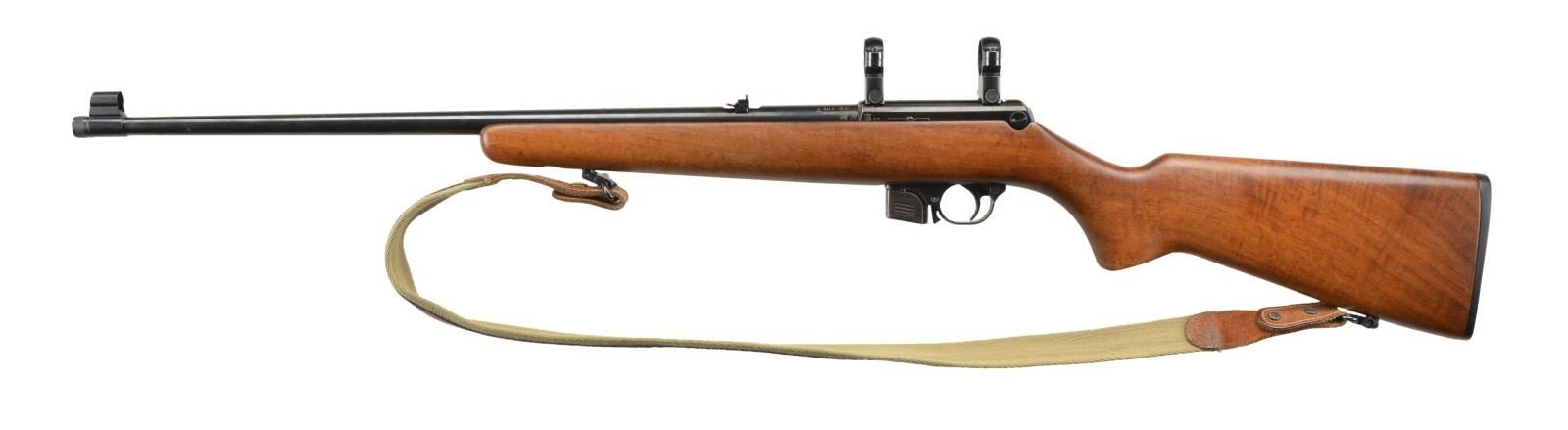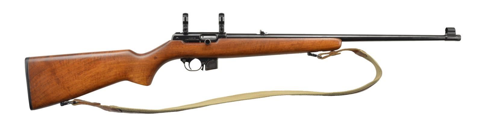Cal. 22 LR. S# 09039 (1960). Duffy's Inc. Spark MD import marked 22.5" bbl. w/ threaded muzzle, hooded ramp bead front sight & 2 leaf 100m rear sight. Bbl. & receiver hav British proofs near left side breech. Tall tip off scope rings. Walnut pistol grip stock w/ buttplate. Tan sling on QD swivels & studs. MAGS: 1 - 5 rd. CONDITION: Very good blue w/ light marks. Near excellent wood. Near excellent bore. (22-2319/MD). CURIO. $300-500.
