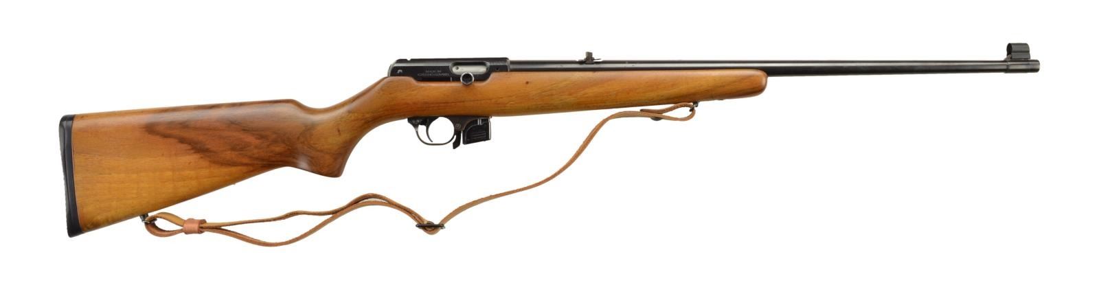 Cal. 22 LR. S# 15599 (1962). Duffy's Inc. Spark MD import marked 22" bbl. w/ hooded ramp bead front sight & 2 leaf 100m rear sight. Walnut pistol grip stock w/ added Pachmayr recoil pad. Tan sling on QD swivels. MAGS: 1 - 8 rd. CONDITION: Very good blue w/ light marks & pinprick oxidation. Very good wood w/ few deep impressions. Near excellent bore. (22-2320/MD). MODERN. $300-500.