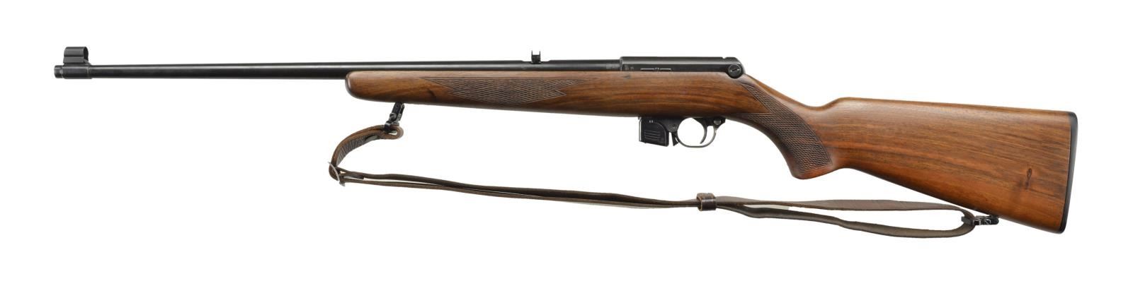Cal. 22 LR. S# 41486 (1975). Duffy's Inc. Sparks MD import marked 22.5" bbl. w/ hooded ramp bead front sight & 2 leaf 75m rear sight. Grooved receiver Walnut pistol grip stock w/ buttplate. Brown leather sling on Allen QD swivels. MAGS: 1 - 5 rd. CONDITION: near excellent overall appearance w/ light wear, pinprick oxidation & marks around rear sight. Near excellent bore. (22-2321/MD). MODERN. $300-500.