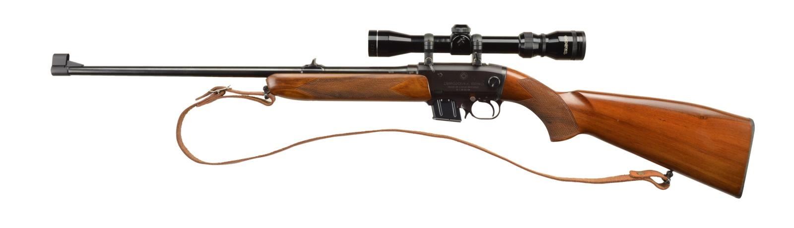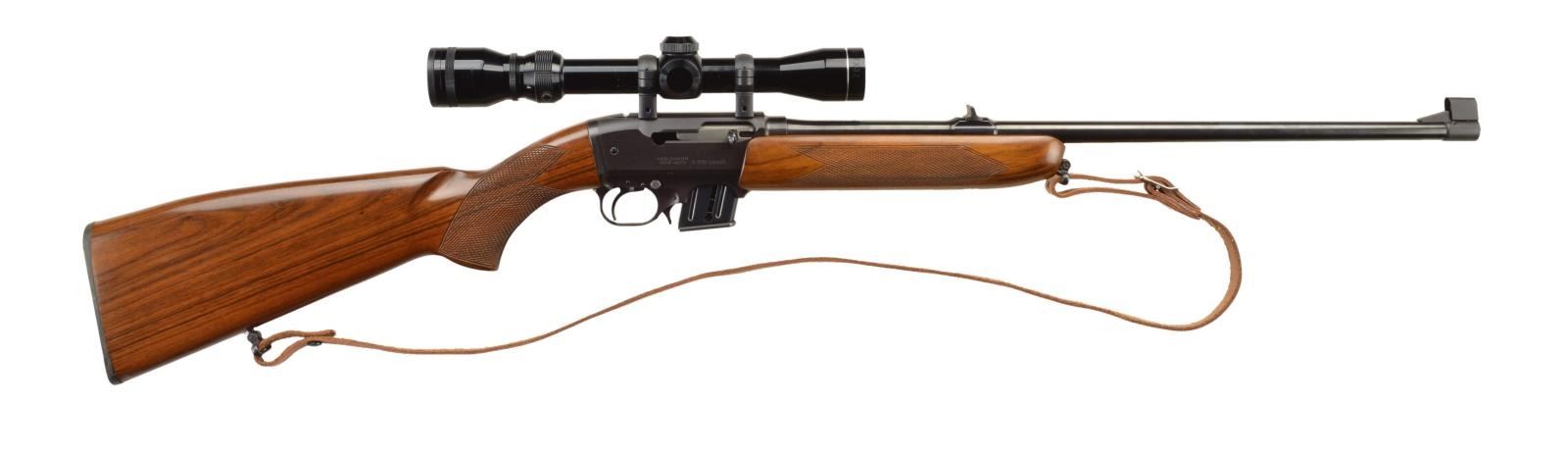 Cal. 22 WMR. S# 5 515 09421 (1995). Bbl. 20 1/2" w/ Hooded ramp blade front sight & fixed rear sight. Tasco Wideview 7x32 scope w/ duplex reticle on QD rings on grooved receiver. Walnut stock set. Narrow brown leather sling on swivels. MAGS: 1 - 10 rd. CONDITION: near excellent w/ marks in stock. Near excellent bore. (22-2386/MD). MODERN. $400-600.