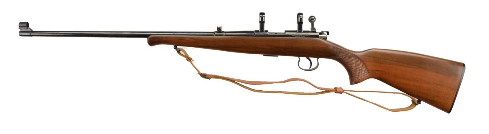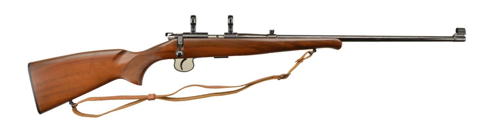 Cal. 22 LR. S# 46665 (1948). CAI import marked 23" bbl. w/ hooded ramp bead front sight & 100m 2 leaf rear sight. Tall scope rings on matted grooved receiver. Schnabel tipped checkered walnut stock. Brown leather sling on swivels. MAGS: 1 - 5 rd. CONDITION: very good reblued metal finish. Near excellent stock w/ light marks. Very good bore. (22-2359/MD). CURIO. $300-500.