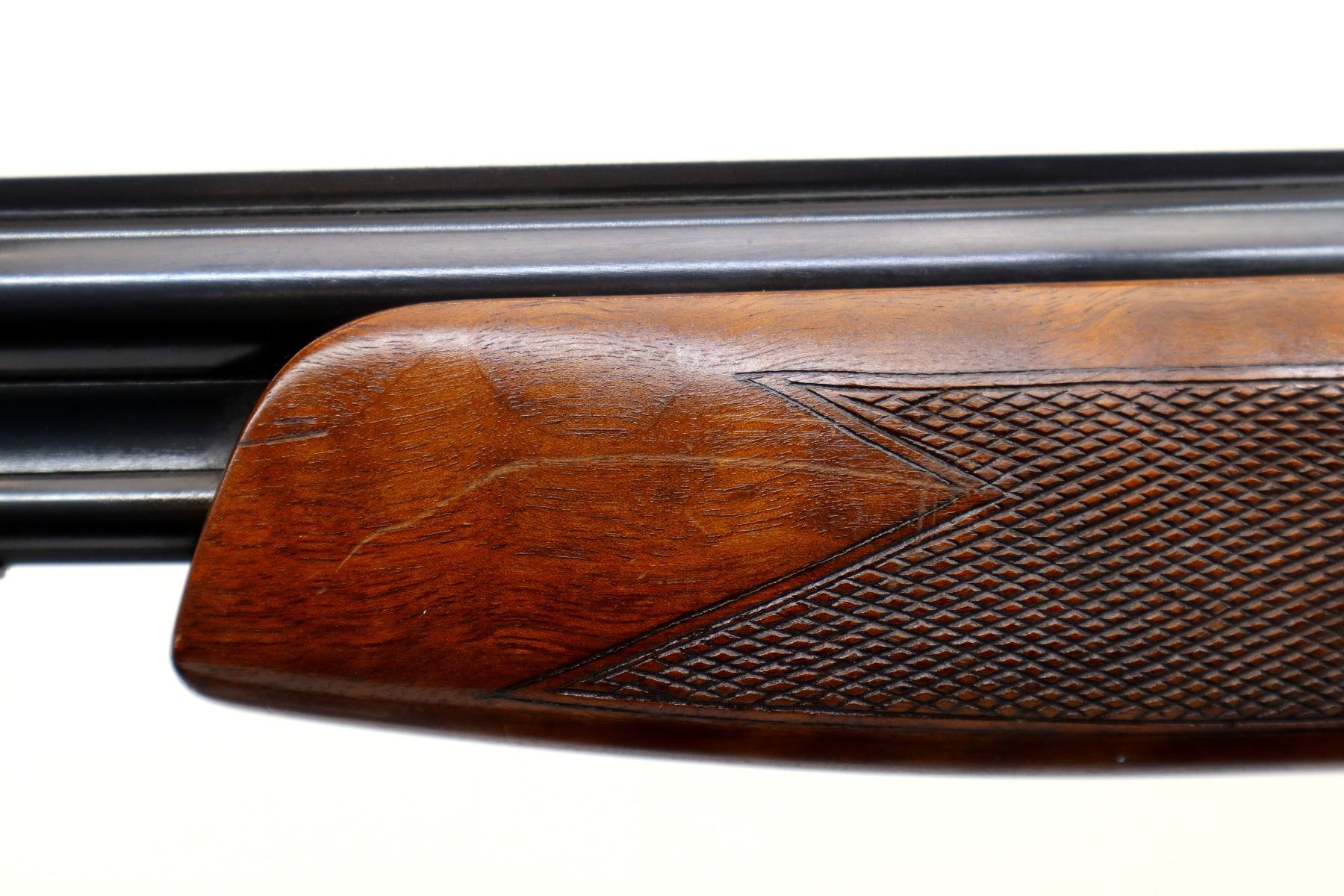 Main Description: Missing front sight dovetail present, adjustable u notched rear sight, blued finish, solid rib with integral scope base at rear, automatic safety, extractor, double triggers. Two piece wood stocks, checkered forearm and pistol grip, cheek rest with added on wood comb extension, brown vented rubber recoil pad, grip cap, sling swivels.