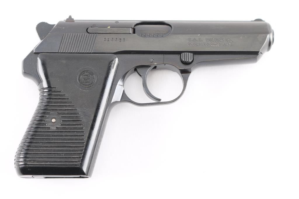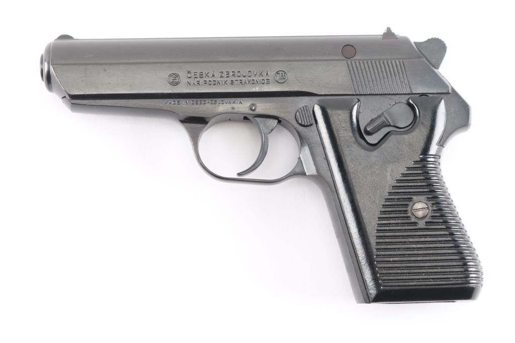 'Vz.50' Czechoslovakian semiautomatic pistol imported by CAI, Georgia VT. Dated 1950. Features fixed sights, approx. 3.5 inch barrel, frame mounted manual decocker/safety, double and single action, black plastic "CZ" logo grips with ribbed texture. Bore is very good condition. Probably reblued before importation, retaining 95% finish with handling marks. Grips are very good. Serial is importer applied, previous numbers visible on slide & barrel. No Magazine.