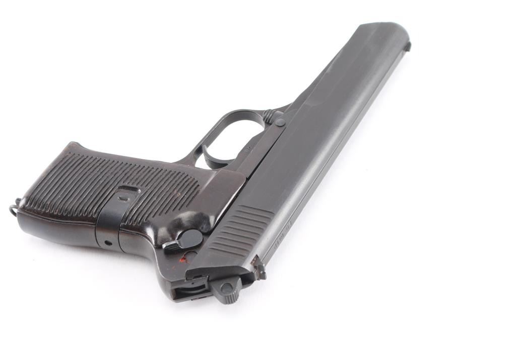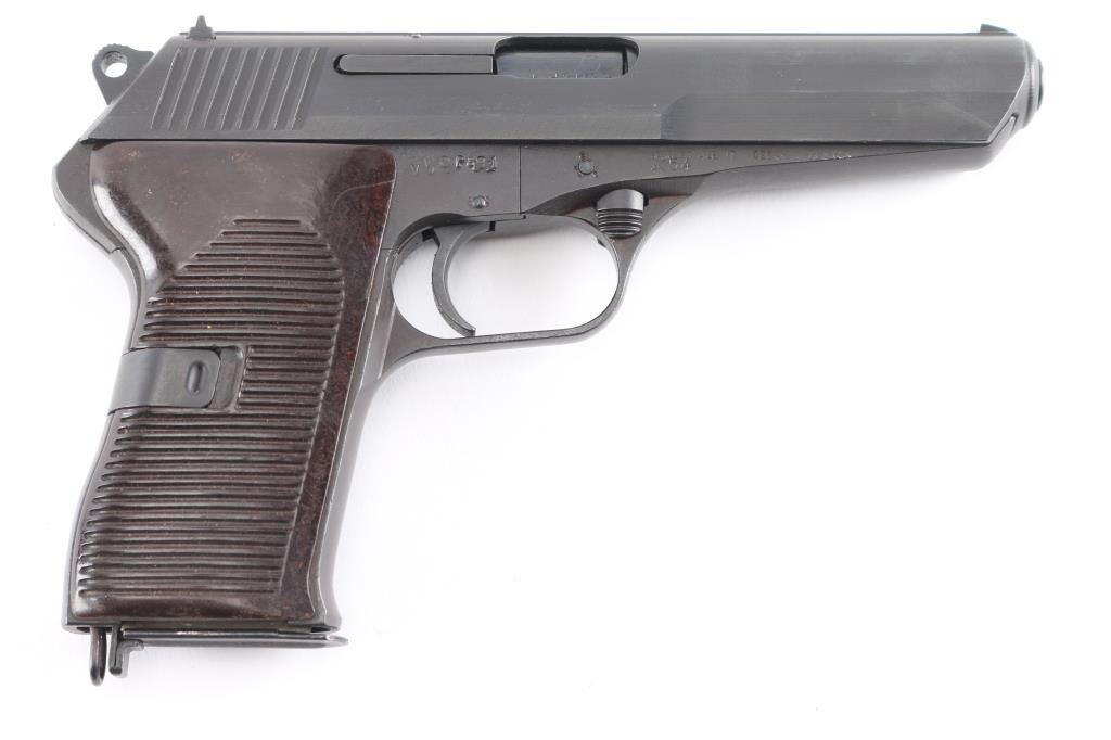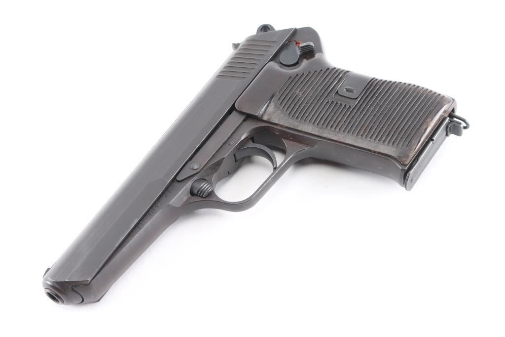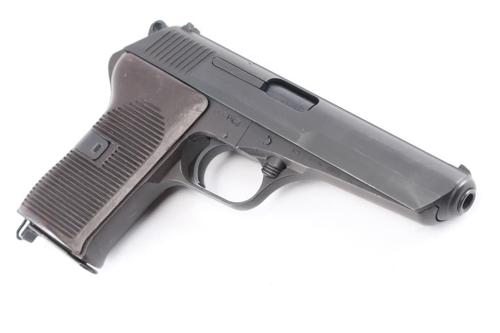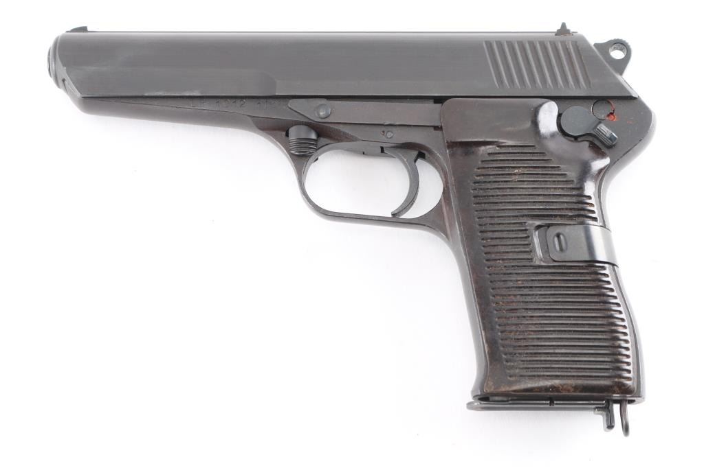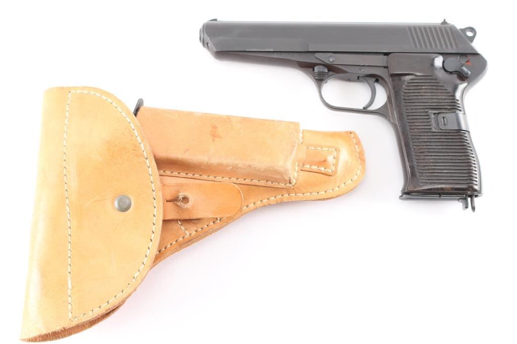 Czech military pistol imported by CAI, St Albans VT. Features matte medium gray finish, grooved brown plastic grips, 4.8" barrel, fixed sights, decocking safety, single action trigger, heel magazine release, lanyard ring. Bore is very good condition. Retains 95% arsenal re-finish, with minor edge losses. Numbers match on barrel, frame & slide. Includes good condition tan leather flap holster, cleaning rod, two magazines.