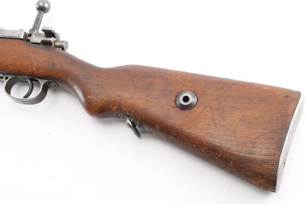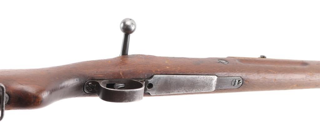 Czechoslovakian military bolt action service rifle, manufactured in Brno by Ceskoslovenská zbrojovka circa 1924 - 1930. Features blued refinish, 29.13" barrel, dovetailed inverted ‘v’ front sight, tangent rear sight graduated to 1900 meters, bayonet lug, bottom mounted sling swivels, 5 round internal box magazine, straight bolt handle, three-position flag safety on the rear of the bolt, smooth wood handguard and semi-pistol grip shoulder stock with grasping grooves in the forend & smooth metal buttplate. serial number matched on bolt, and receiver. Standard Czech markings.(Faint) no sn on stock. Imported by CAI (Barrel) Cleaning rod present. Bore is dark/rough rifling. Rifle retains 65% finish, turning dull, bare metal showing on edges & corners and where parts rub during operation. Wood is very good/sound overall, many small dents & scratches. Handguard appears to be a newer replacement. Used until the end of WW2. NRA Condition-Fair/Bore. C&R Firearm.