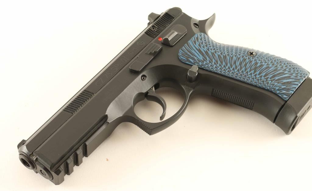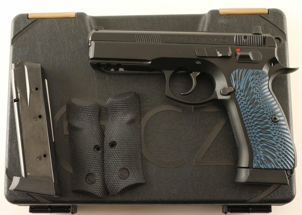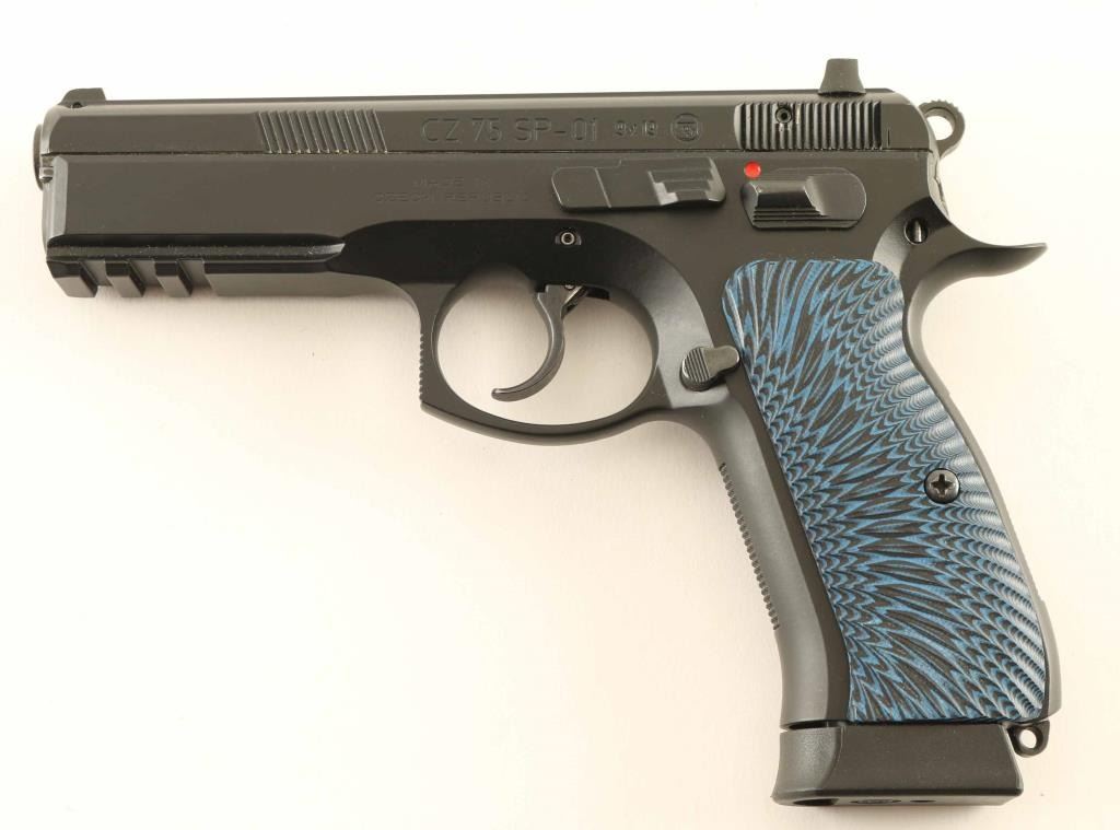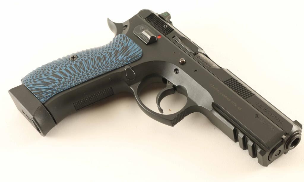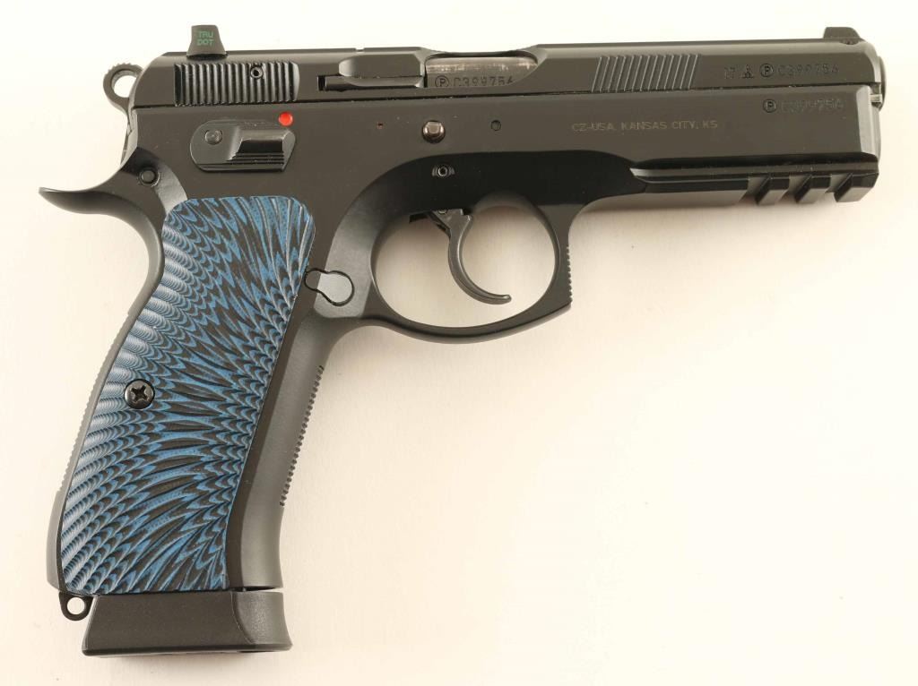 Czech made all steel CZ 75 platform double action semi-automatic full size pistol chambered in 9x19mm, manufactured circa 2017. Features a matte black polycoat finish, 4.6" cold hammer forged barrel, three-dot night sights, fore & alt cocking serrations on the slide, smooth trigger, serrated round hammer spur, ambidextrous manual safety on the frame, push button magazine release, 18 round factory magazine, full-length dust cover with integral accessory rail, knurled sections on the grip straps, lanyard loop on the butt of the frame and two-piece textured blue/black G10 grips. Includes the original factory hard case with documents, OEM checkered black rubber grips, spare magazine, and cleaning tools. Pistol exhibits approximately 97% of it's original finish showing slide wear on the barrel, a couple minor handling marks and a few dulled serrations on the rear left side of the slide. Action is smooth, the bore is pristine and the custom grips are fine. Condition is NRA Excellent in box. ***Modern Firearm***