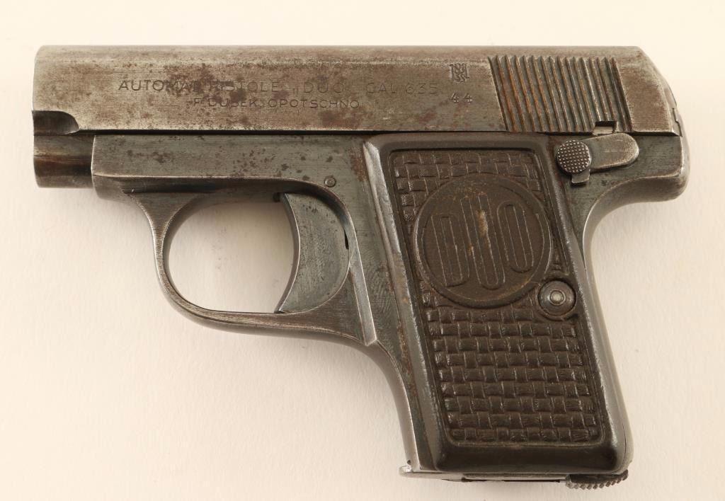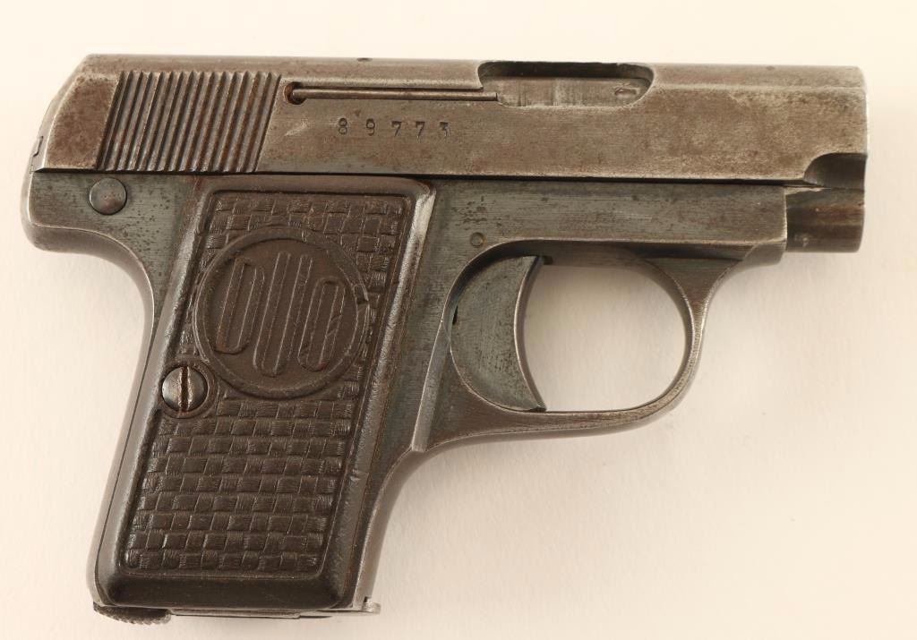 Single action semi-automatic pocket pistol chambered in 6.35mm, produced in Czechoslovakia during German occupation circa 1944. Features a blued finish, 2" barrel, sighting channel cut in the top of the slide, smooth trigger, manual safety, 6 round magazine, steel frame and two-piece bakelite grips with woven design. Pistol exhibits approximately 40% of it's original blued finish showing heavy carrying wear with some oxidation and light surface rust. Action performs well, bore is very good and bakelite grips are good++. Condition is good. ***C&R Firearm*** ***Modern Firearm***