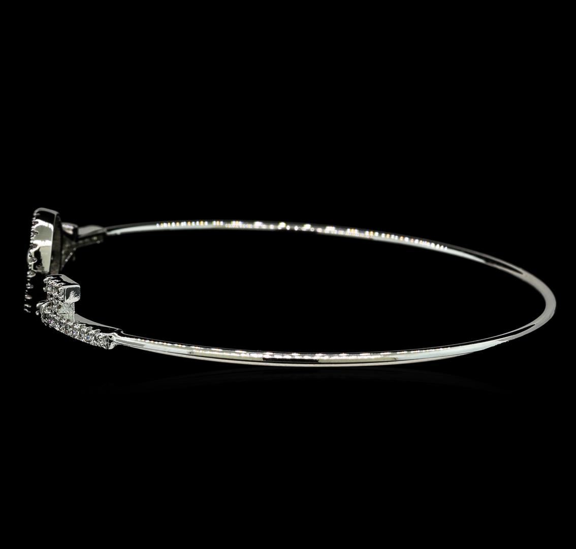 High end designer jewelry. CZ Key Open Bangle Bracelet - Rhodium Plated. Rhodium Plated Metal. Silver/ Clear. Adjustable. Total Weight: 4.3 grams.