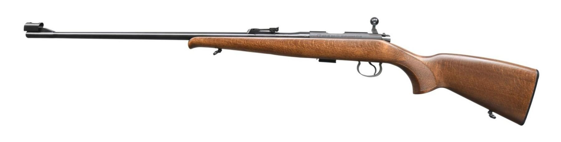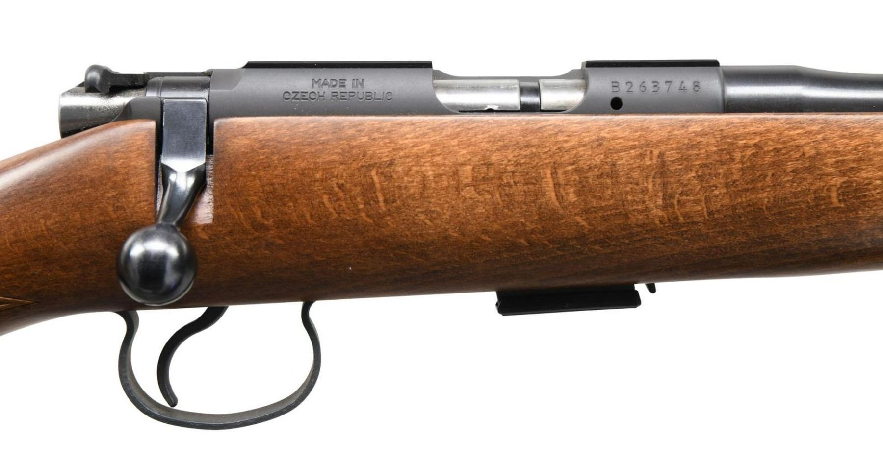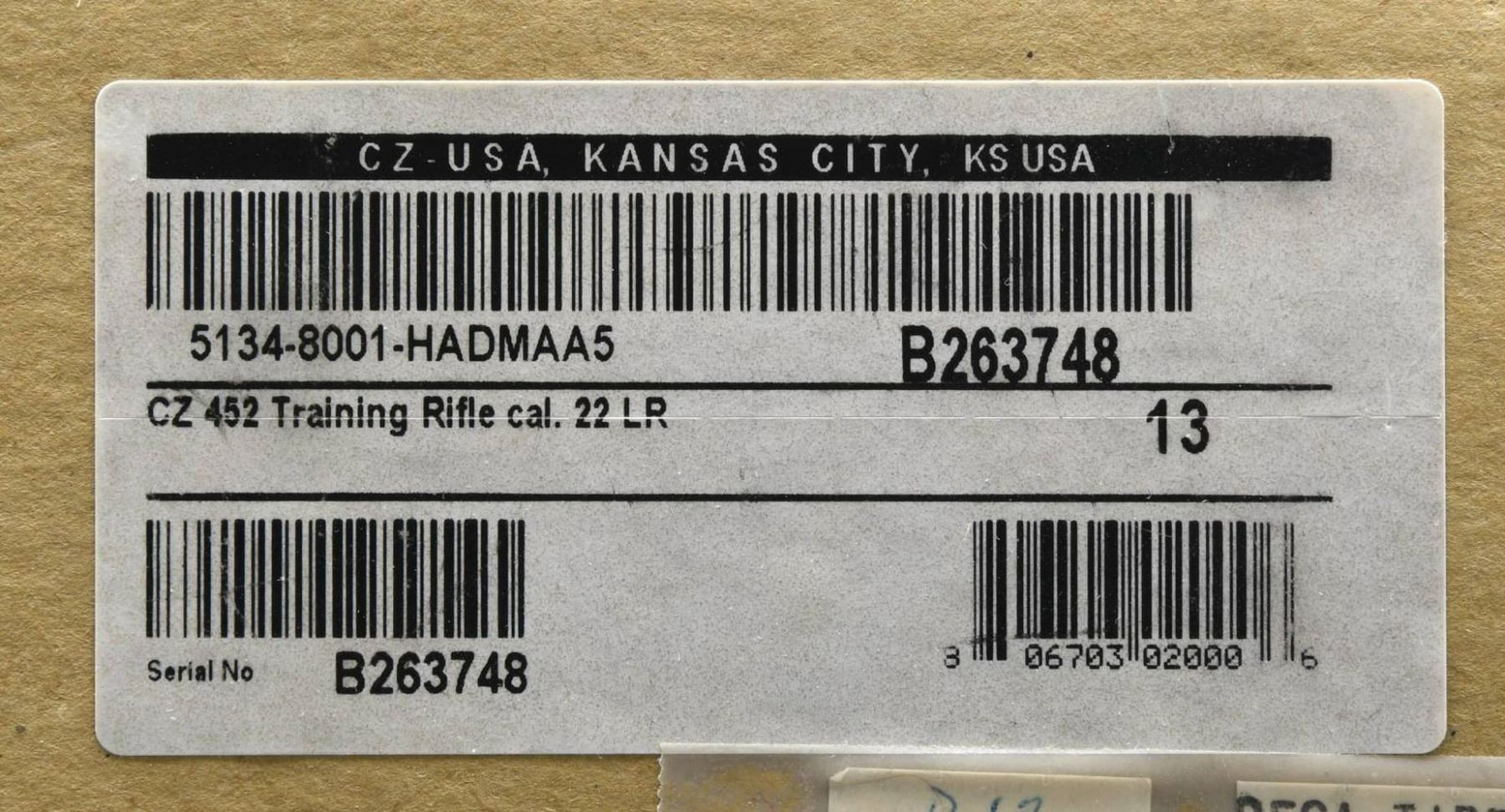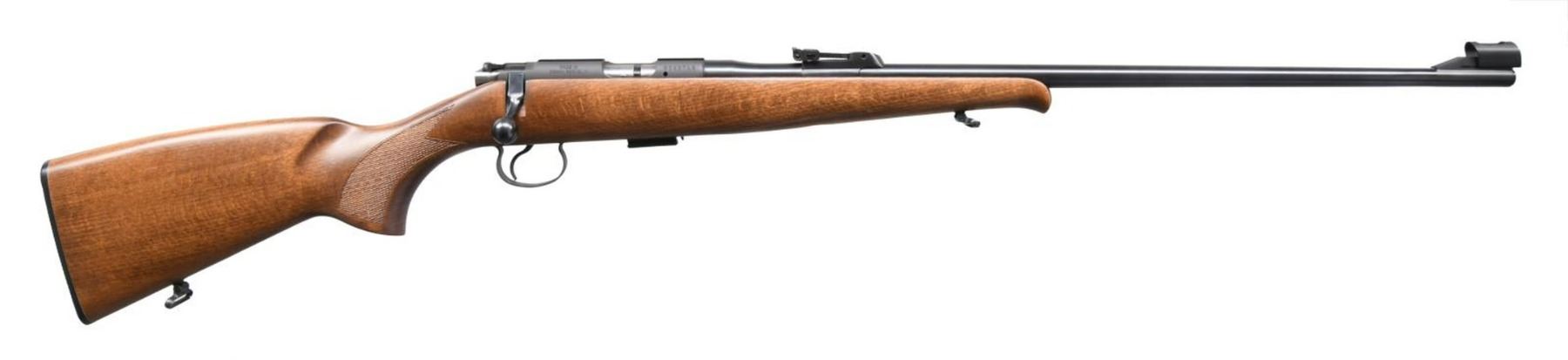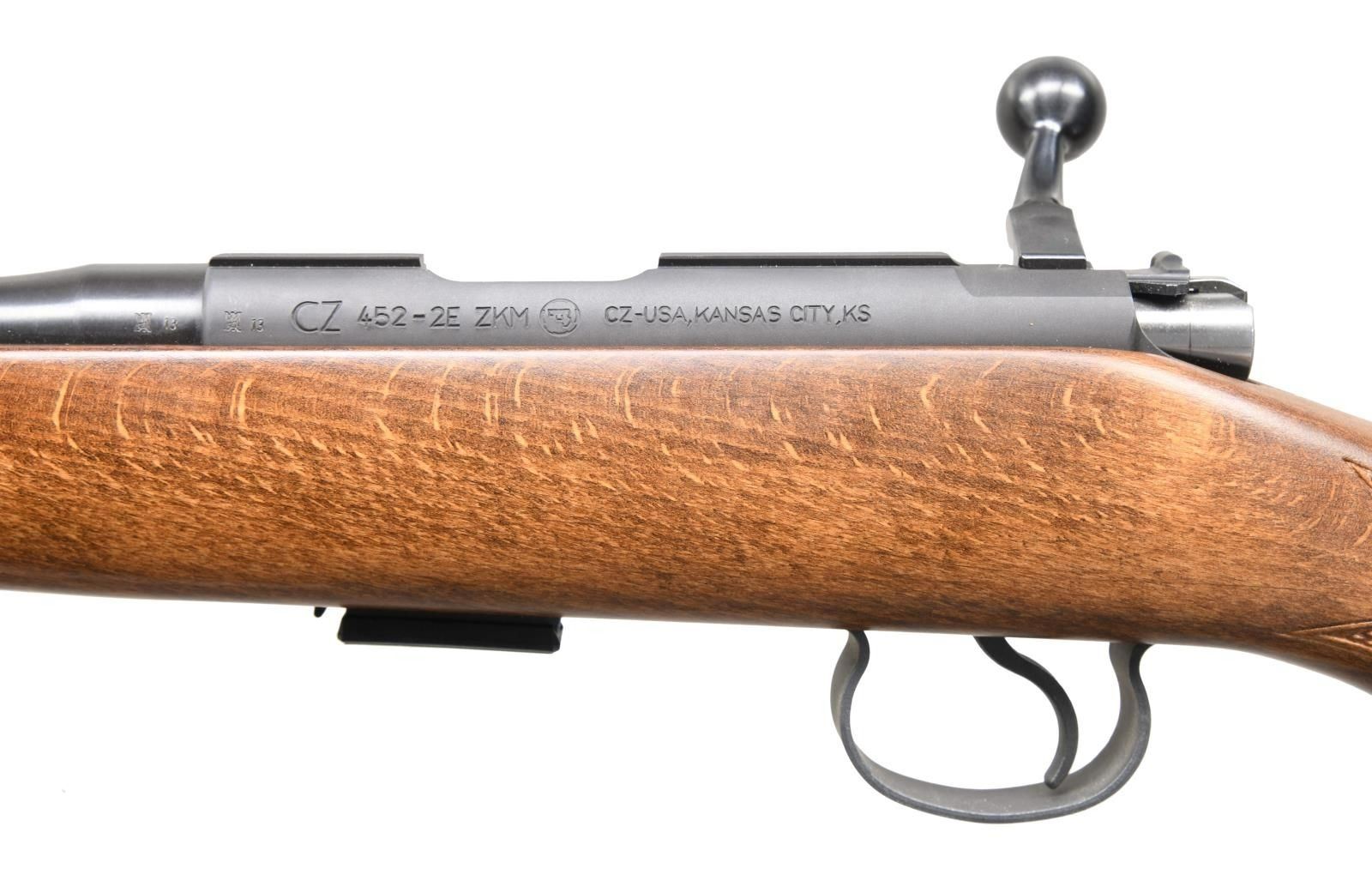 MATCHING FACTORY BOX. Cal. 22 LR. S# B263748. Bbl. 24 7/8". Model 452-2E ZKM bolt action rifle mfg. by CZ in the Czech Republic and imported by CZ-USA. Left side of bbl. is marked with the cal. designation, with the model designation and CZ-USA's importer information marked on the left side of the receiver. Matte blued receiver and trigger guard with blued bbl. Ramped and hooded blade front sight with U-notch rear sight. Checkered wood pistol grip buttstock with schnabel tip forend. MAGS: 1 5-rd. UNATTACHED ACCESSORIES: matching factory box. CONDITION: near new, with metal components retaining virtually all of their original factory finishes overall. Mirror bore, exhibiting well defined rifling throughout. Wood stock is excellent overall. Box shows some mild exterior wear, but otherwise remains sturdy and serviceable. PROVENANCE: The Collection of Gun Sport Ltd owned by Jon R. Thomas. (23-3634/MLW). MODERN. $300-450.
