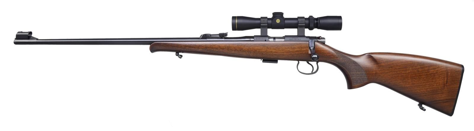 Cal. 22 LR. S# B364629. Bbl. 24 3/4" rnd. w/ hooded ramp mounted blade front sight & military style graduated leaf rear sight. Leupold VX-I 2-7x28 matte finished rimfire scope w/ duplex reticle on tip off mts. Schnable tipped sporter stock w/ European comb, checkered wrist, sling swivels & plastic buttplate. MAGS: 1 detachable 5 rd. CONDITION: over 98% wood & metal finish. Bright near excellent bore. Scope has clear optics. (20-3031/DS). MODERN. $450-650.