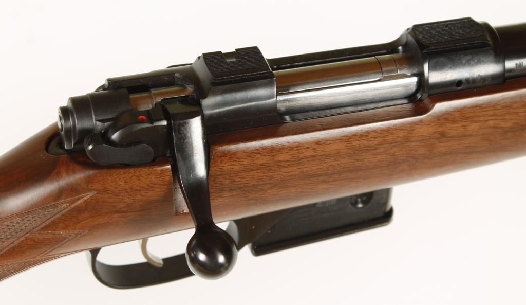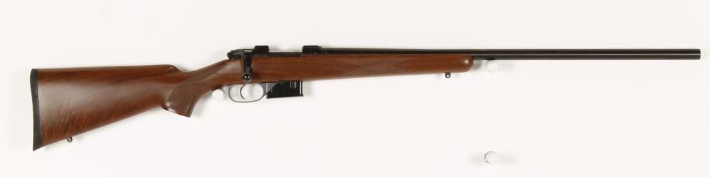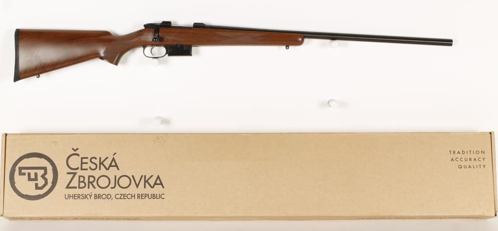 Bolt action magazine fed varmint rifle with 16" heavy barrel made in the Czech Republic. Blued finish, checkered pistol grip walnut stock, black rubber butt pad, sling swivel studs, no sights, and receiver dove tailed for scope rings. Includes original box, manual, and one magazine. Condition: Excellent *MODERN FIREARM*