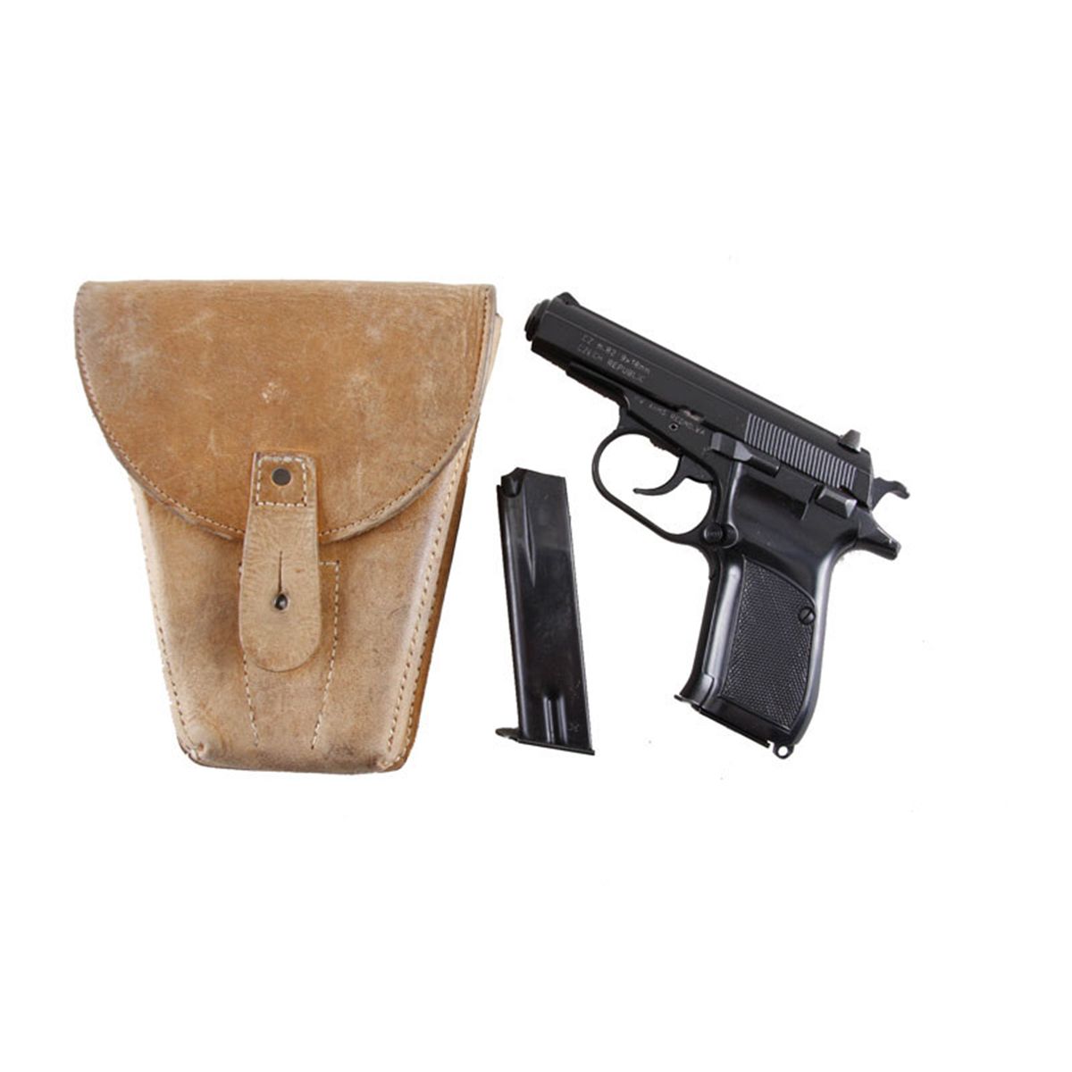 Condition: Excellent with littlDouble action semi-auto pistol made in the Czech Republic. Black finish, black checkered grips, 3 3/4" barrel with 3 dot sights, good bore and action. Includes leather holster and lanyard.Condition: Excellent with little sign of use. 2 magazines. 'NOT CALIFORNIA LEGAL"
