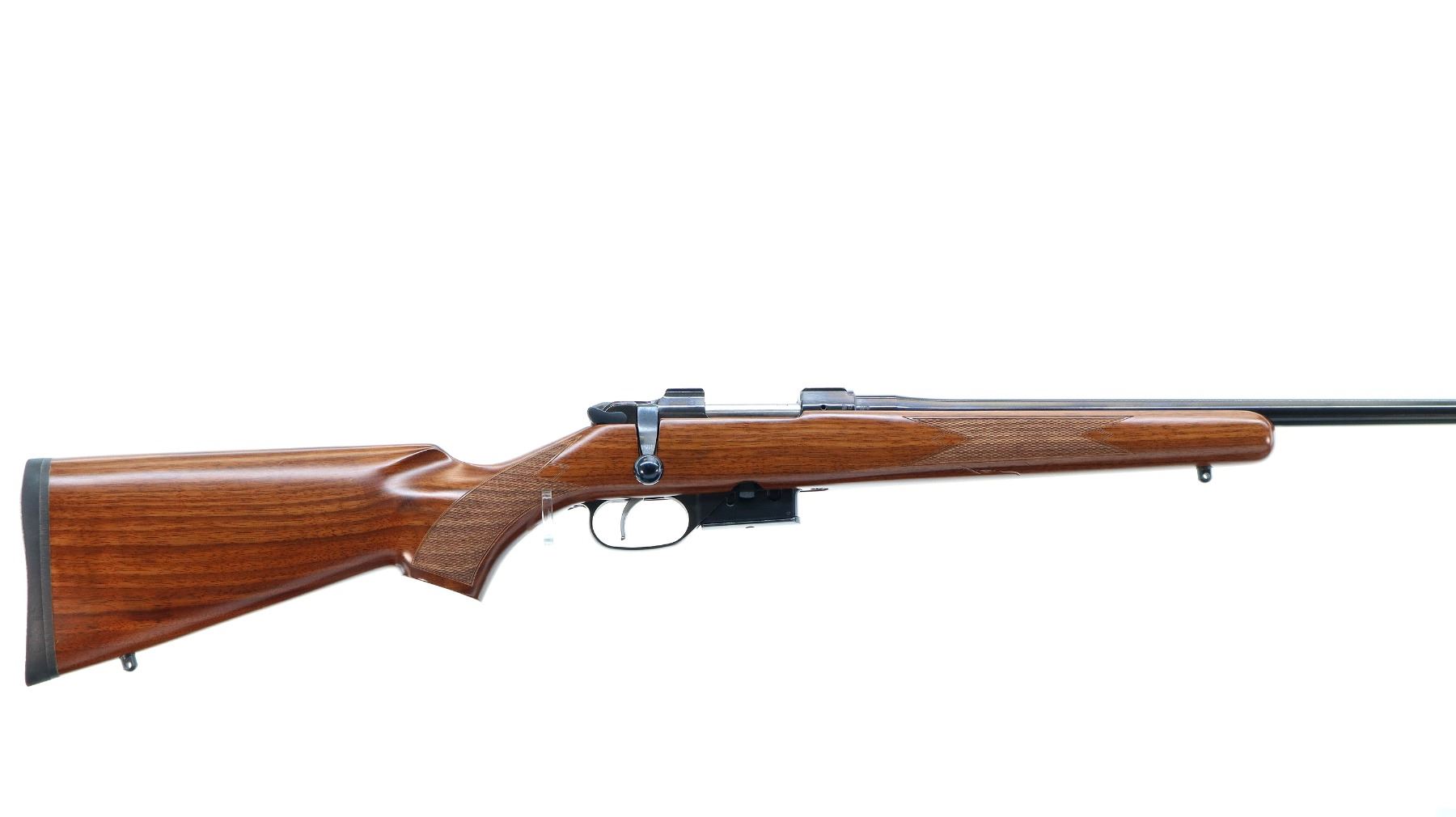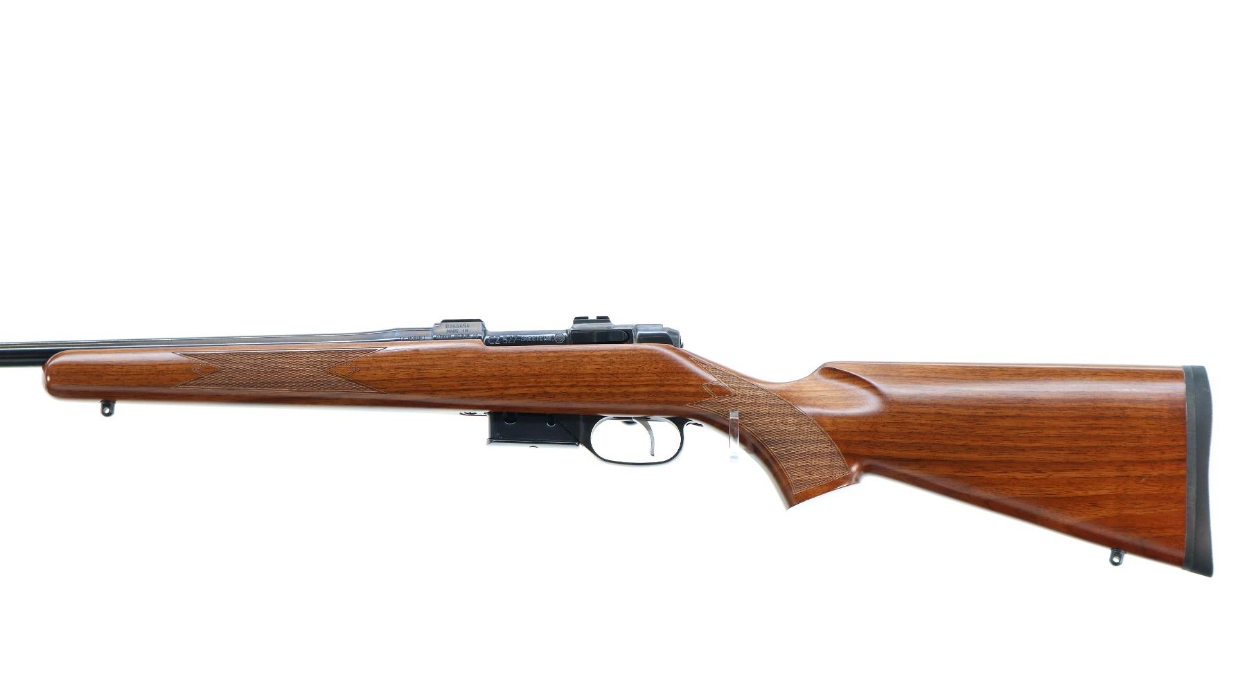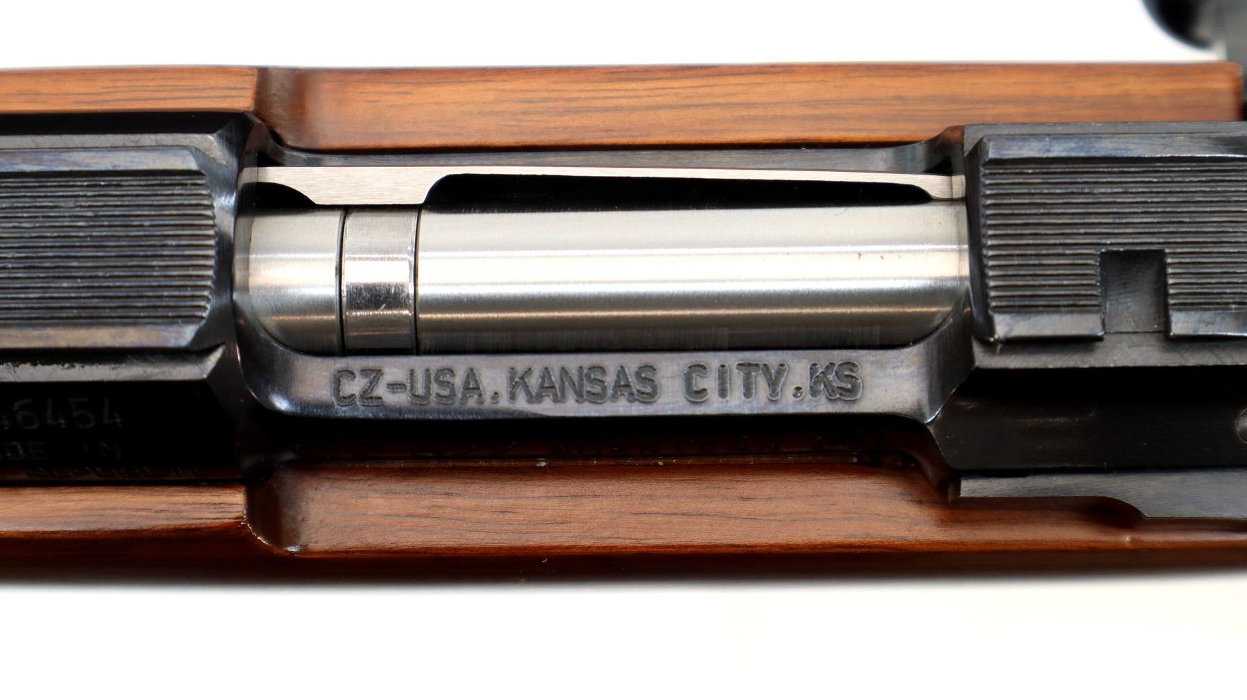 Main Description: No sights, polish blued finish, receiver has integral scope bases, smooth bolt knob. One piece wood stock, checkered forearm and pistol grip, black rubber recoil pad, swivel studs.