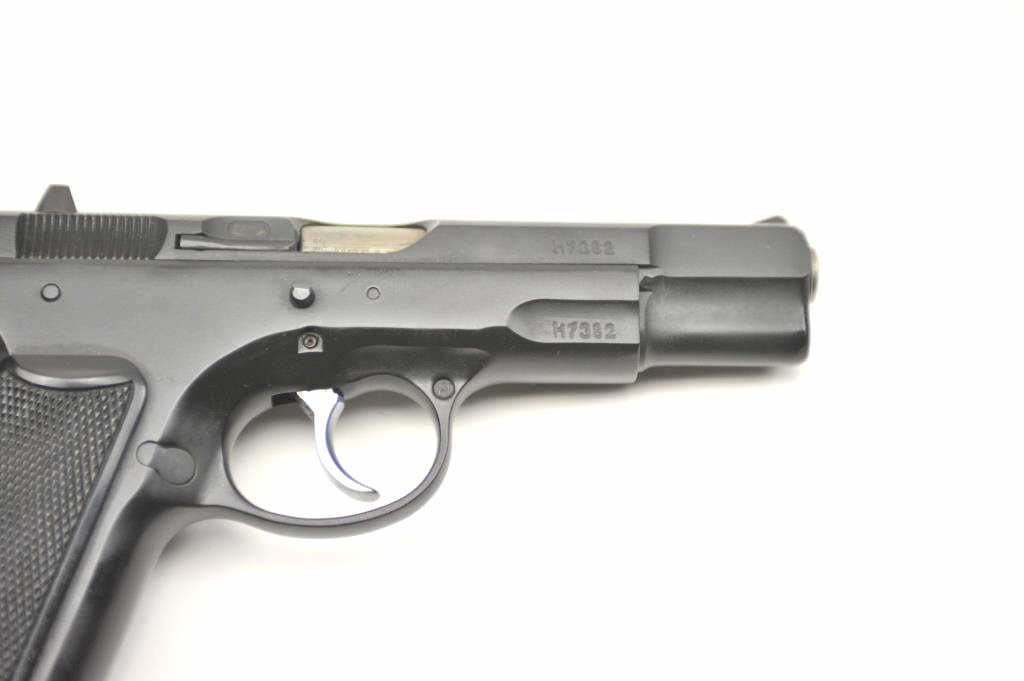 CZ Model 75 Double Action Semi-Auto Pistol in 9mm with high cap mag (Magazine Cannot be transferred in CA unless blocked), S/N H1382. Near fine condition with nearly all black matt finish. Fine composite grips. “A.A.L.”import marks. Fine bore. Showing minimal firing and use. (Modern/PPT) Est.: $400-$800