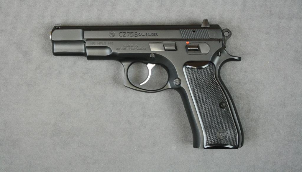 CZ Model 75B DA semi-auto pistol, 9mm cal.,  4-1/2” barrel, black finish, checkered  plastic grips, no magazine, #6767A. This gun  is in like new condition showing little use  or handling.  Est.:  $250-$500.